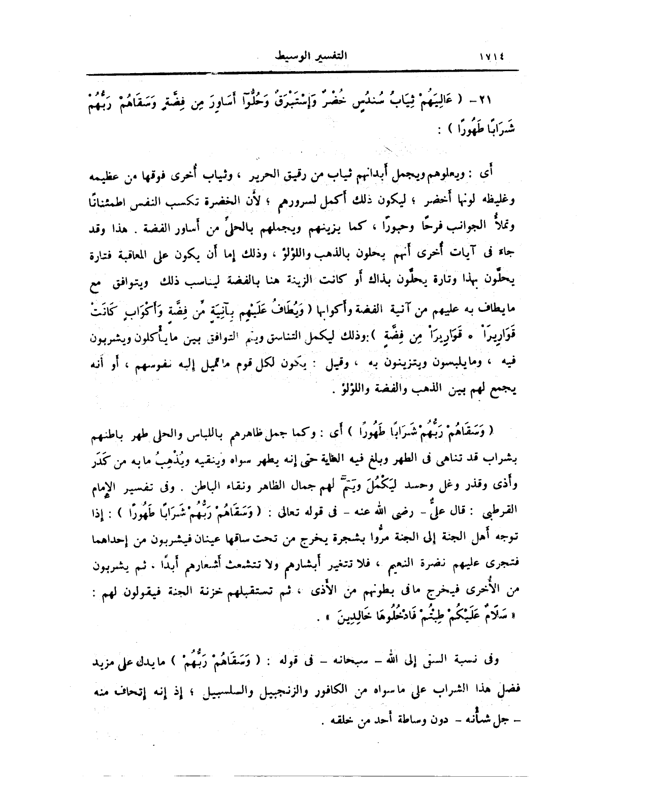 21 - (عَالِيَهُمْ ثِيَابُ سُندُسٍ خُضْرٌ وَإِسْتَبْرَقٌ وَحُلُّوا أَسَاوِرَ مِنْ فِضَّةٍ وَسَقَاهُمْ رَبُّهُمْ شَرَابًا طَهُورًا):