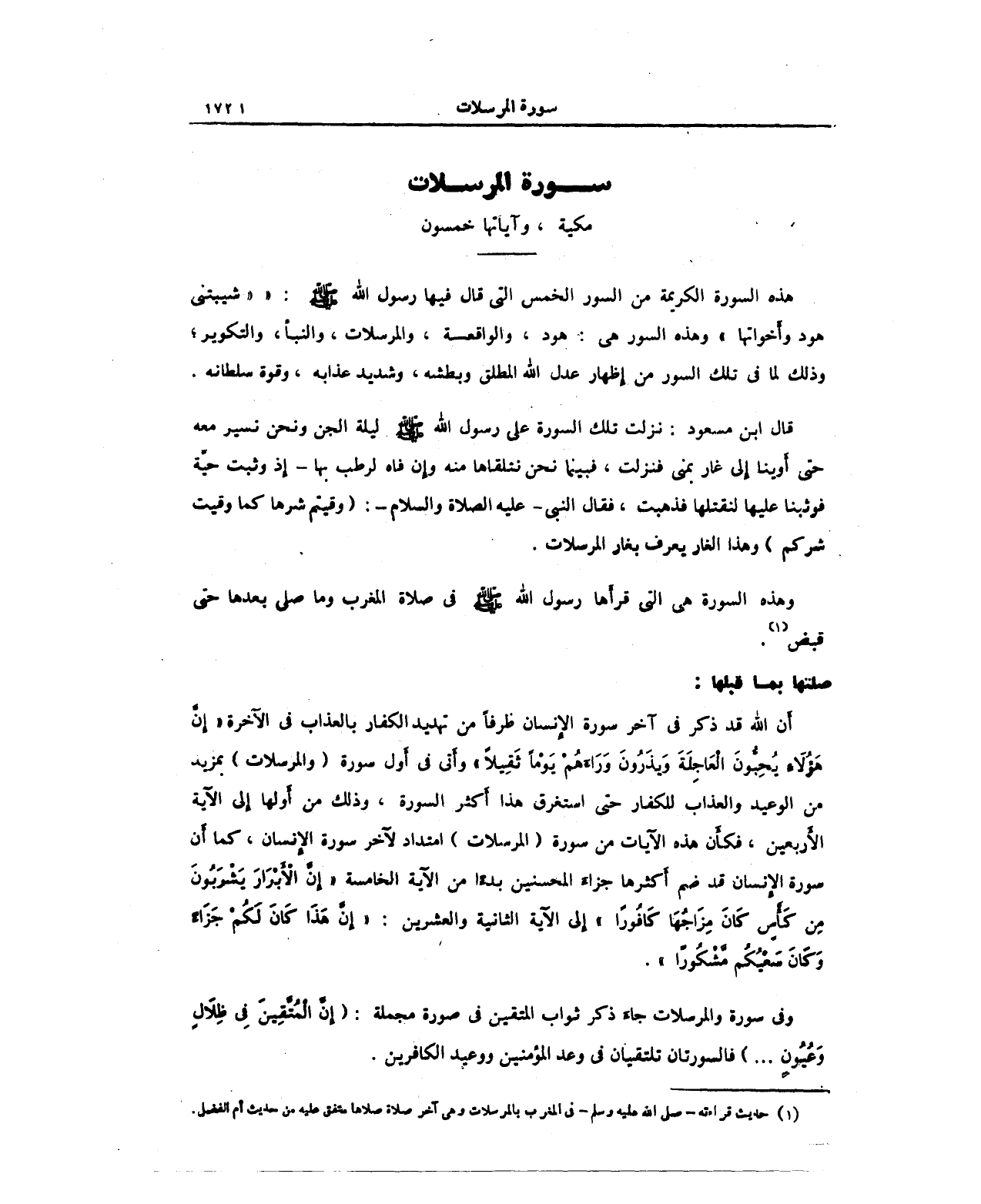 قال ابن مسعود: نزلت تلك السورة على رسول الله صلى الله عليه وسلم ليلة الجن ونحن نسير معه حتى أَوينا إِلى غار بمنى فنزلت، فبيمنا نحن نتلقاهم منه وإِن فاه لرطب بها -إِذ وثبت حيَّة فوثبنا عليها لنقتلها فذهبت، فقال النبي -عليه الصلاة والسلام-: (وقيتم شرها كما وقيت شركم) وهذا الغار يعرف بغار المرسلات.