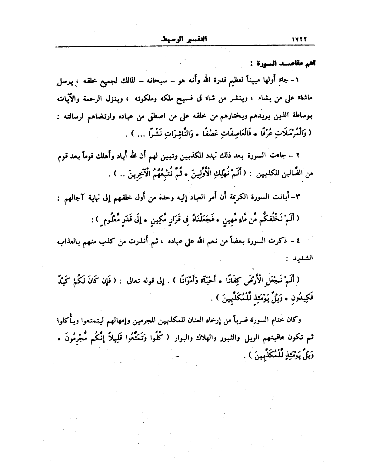 (أَلَمْ نَجْعَلْ الأَرْضَ كِفَاتًا * أَحْيَاءً وَأَمْوَاتًا). إلى قوله تعالى: (فَإِنْ كَانَ لَكُمْ كَيْدٌ فَكِيدُونِ * وَيْلٌ يَوْمَئِذٍ لِلْمُكَذِّبِينَ).