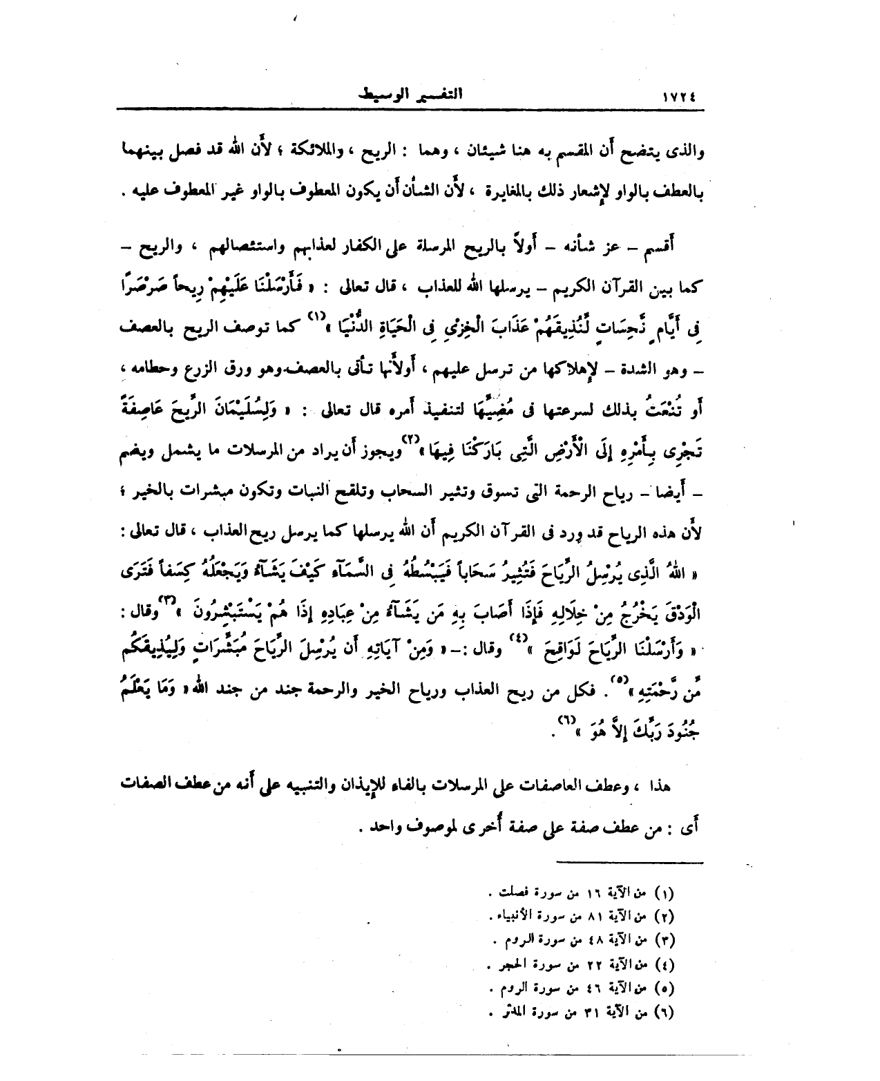 أَقسم -عز شأْنه- أَولًا بالريح المرسلة على الكفار لعذابهم واستئصالهم، والريح -كما بين القرآن الكريم- يرسلها الله للعذاب، قال تعالى: "فَأَرْسَلْنَا عَلَيْهِمْ رِيحًا صَرْصَرًا فِي أَيَّامٍ نَحِسَاتٍ لِنُذِيقَهُمْ عَذَابَ الْخِزْيِ فِي الْحَيَاةِ الدُّنْيَا" (¬1) كما توصف الريح بالعصف -وهو الشدة- لإِهلاكها من ترسل عليهم، أَو لأَنها تأتي بالعصف. وهو ورق الزرع وحطامه، أَو تُنْعَتُ بذلك لسرعتها في مُضِيِّهَا لتنفيذ أَمره قال تعالى: "وَلِسُلَيْمَانَ الرِّيحَ عَاصِفَةً تَجْرِي بِأَمْرِهِ إِلَى الأَرْضِ الَّتِي بَارَكْنَا فِيهَا" (¬2) ويجوز أَن يراد من المرسلات ما يشمل ويضم -أَيضا- رياح الرحمة التي تسوق وتثير السحاب وتلقح النبات وتكون مبشرات بالخير؛ لأَن هذه الرياح قد ورد في القرآن الكريم أَن الله يرسلها كما يرسل ريح العذاب، قال تعالى: "اللَّهُ الَّذِي يُرْسِلُ الرِّيَاحَ فَتُثِيرُ سَحَابًا فَيَبْسُطُهُ فِي السَّمَاءِ كَيْفَ يَشَاءُ وَيَجْعَلُهُ كِسَفًا فَتَرَى الْوَدْقَ يَخْرُجُ مِنْ خِلالِهِ فَإِذَا أَصَابَ بِهِ مَنْ يَشَاءُ مِنْ عِبَادِهِ إِذَا هُمْ يَسْتَبْشِرُونَ" (¬3) وقال: "وَأَرْسَلْنَا الرِّيَاحَ لَوَاقِحَ" (¬4) وقال: "وَمِنْ آيَاتِهِ أَنْ يُرْسِلَ الرِّيَاحَ مُبَشِّرَاتٍ وَلِيُذِيقَكُمْ مِنْ رَحْمَتِهِ" (¬5). فكل من ريح العذاب ورياح الخير والرحمة جند من جند الله "وَمَا يَعْلَمُ جُنُودَ رَبِّكَ إِلاَّ هُوَ" (¬6).