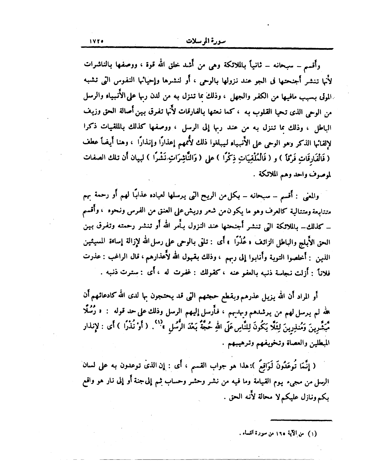 والمعنى: أَقسم -سبحانه- بكل من الريح التي يرسلها لعباده عذابًا لهم أَو رحمة بهم متتابعة ومتتالية كالعرف وهو ما يكون من شعر وريش على العنق من الفرس ونحوه، وأَقسم -كذلك- بالملائكة التي تنشر أَجنحتها عند النزول بأَمر الله أَو تنشر رحمته وتفرق بين الحق والأَبلج والباطل الزائف "عُذْرًا" أَي: تلقى الوحي على رسل الله لإِزالة إِساءة المسيئين الذين: أَخلصوا التوبة وأَنابوا إِلى ربهم، وذلك بقبول الله لأَعذارهم، قال الراغب: عذرت فلانًا: أَزلت نجاسة ذنبه بالعفو عنه، كقولك: غفرت له، أَي: سترت ذنبه.