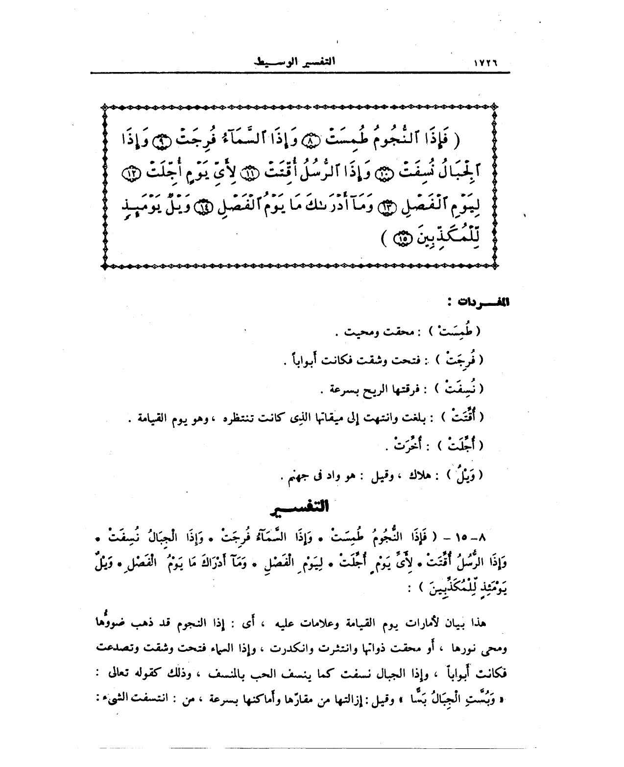 (فَإِذَا النُّجُومُ طُمِسَتْ (8) وَإِذَا السَّمَاءُ فُرِجَتْ (9) وَإِذَا الْجِبَالُ نُسِفَتْ (10) وَإِذَا الرُّسُلُ وُقِّتَتْ (11) لأَيِّ يَوْمٍ أُجِّلَتْ (12) لِيَوْمِ الْفَصْلِ (13) وَمَا أَدْرَاكَ مَا يَوْمُ الْفَصْلِ (14) وَيْلٌ يَوْمَئِذٍ لِلْمُكَذِّبِينَ (15))