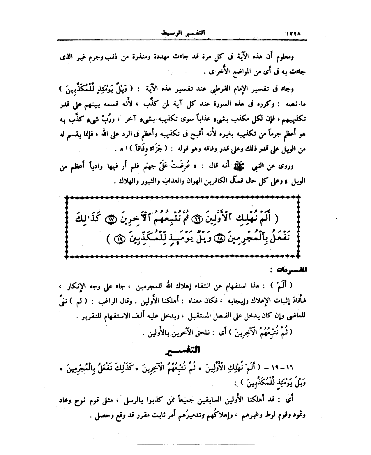 (أَلَمْ نُهْلِكْ الأَوَّلِينَ (16) ثُمَّ نُتْبِعُهُمْ الآخِرِينَ (17) كَذَلِكَ نَفْعَلُ بِالْمُجْرِمِينَ (18) وَيْلٌ يَوْمَئِذٍ لِلْمُكَذِّبِينَ (19)):
