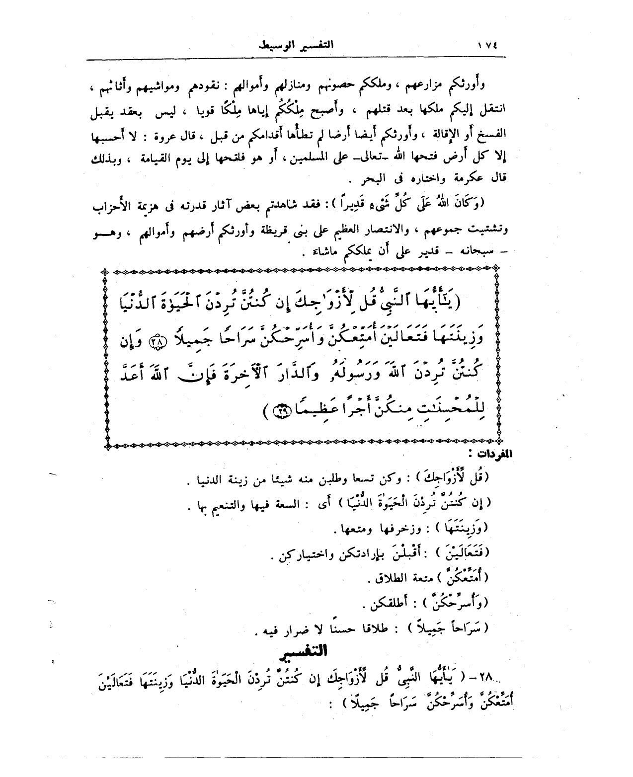 {يَا أَيُّهَا النَّبِيُّ قُلْ لِأَزْوَاجِكَ إِنْ كُنْتُنَّ تُرِدْنَ الْحَيَاةَ الدُّنْيَا وَزِينَتَهَا فَتَعَالَيْنَ أُمَتِّعْكُنَّ وَأُسَرِّحْكُنَّ سَرَاحًا جَمِيلًا (28) وَإِنْ كُنْتُنَّ تُرِدْنَ اللَّهَ وَرَسُولَهُ وَالدَّارَ الْآخِرَةَ فَإِنَّ اللَّهَ أَعَدَّ لِلْمُحْسِنَاتِ مِنْكُنَّ أَجْرًا عَظِيمًا (29)}