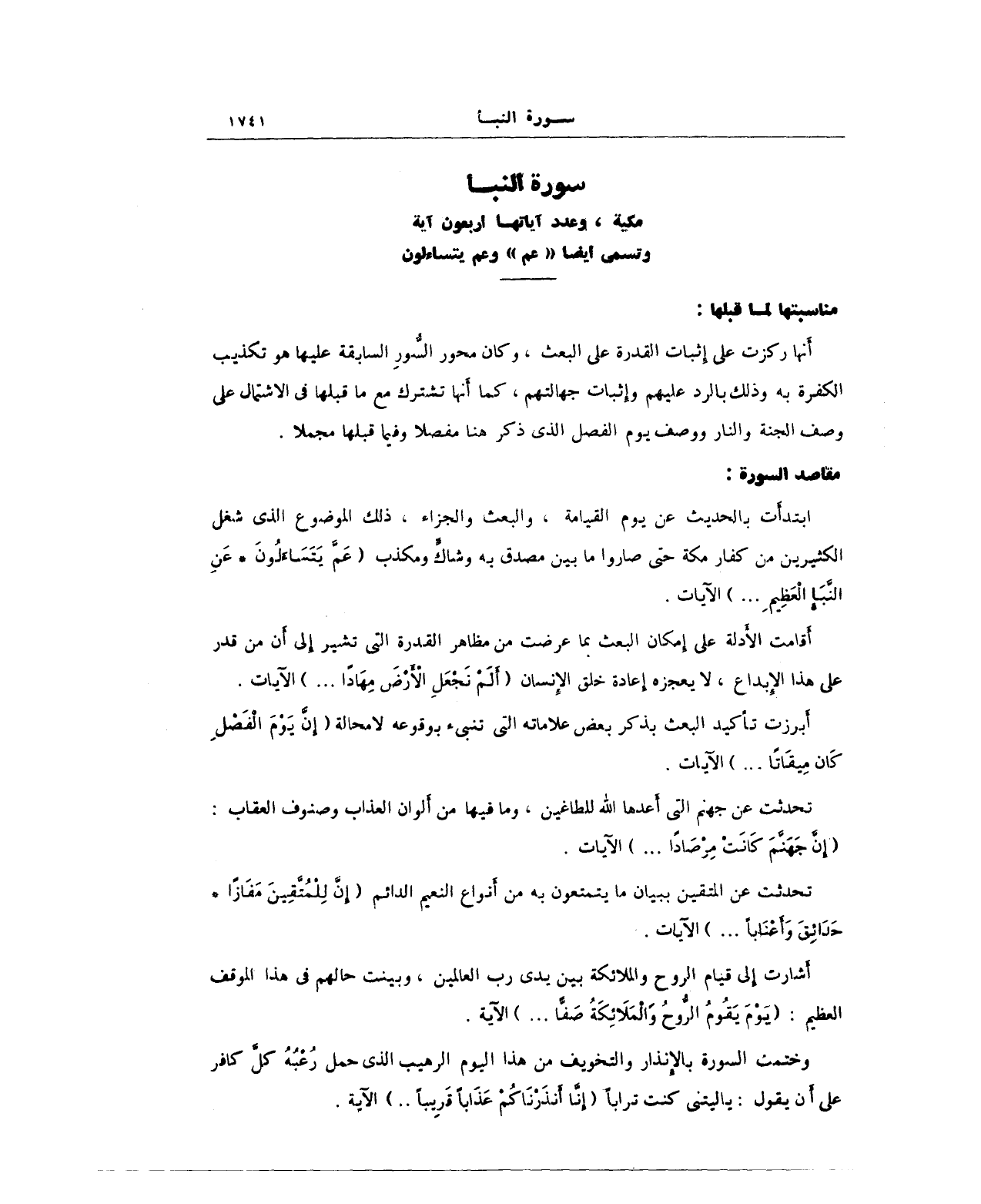 مكية، وعدد آياتها أَربعون آية وتسمى أَيضا "عم" وعم يتساءلون