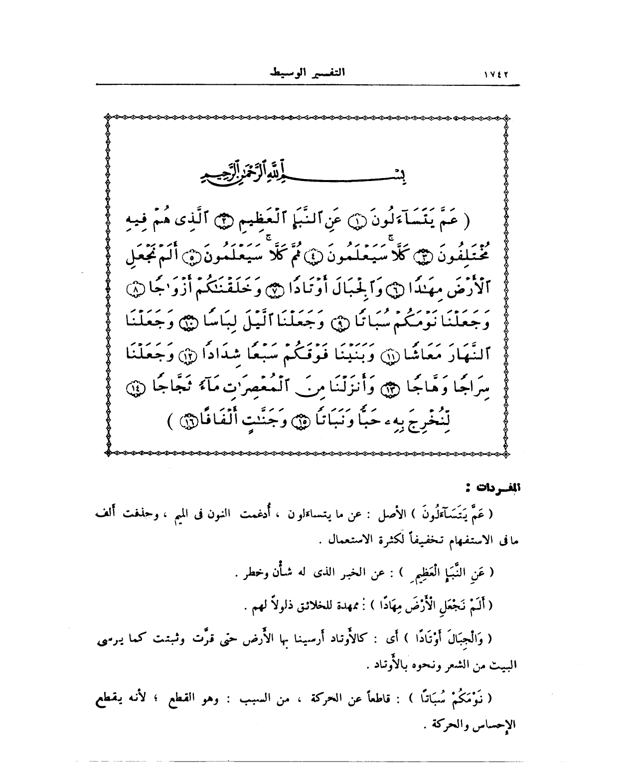 (عَنْ النَّبَإِ الْعَظِيمِ): عن الخير الذي له شأْن وخطر.