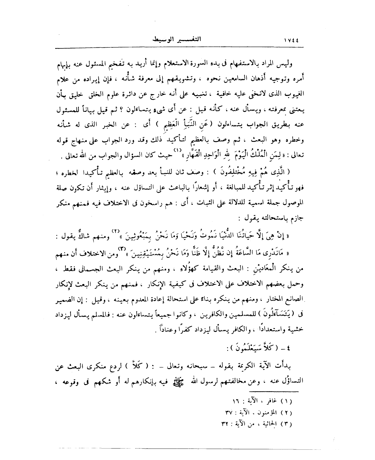 "إِنْ هِيَ إِلاَّ حَيَاتُنَا الدُّنْيَا نَمُوتُ وَنَحْيَا وَمَا نَحْنُ بِمَبْعُوثِينَ" (¬2) ومنهم شاكٌّ يقول: "مَا نَدْرِي مَا السَّاعَةُ إِنْ نَظُنُّ إِلاَّ ظَنًّا وَمَا نَحْنُ بِمُسْتَيْقِنِينَ" (¬3) ومن الاختلاف أَن منهم من ينكر الْمعَاديْنِ: البعث والقيامة كهؤُلاءِ، ومنهم من ينكر البعث الجسماني فقط، وحمل بعضهم الاختلاف في كيفية الإِنكار، فمنهم من ينكر البعث لإِنكار الصانع المختار، ومنهم من ينكره بناءً على استحالة إِعادة المعدوم بعينه، وقيل: إِن الضمير في (يَتَسَاءَلُونَ) للمسلمين والكافرين، وكانوا جميعًا يتساءَلون عنه: فالمسلم يسأل ليزداد خشية واستعدادًا، والكافر يسأَل ليزداد كفرًا وعنادًا.
