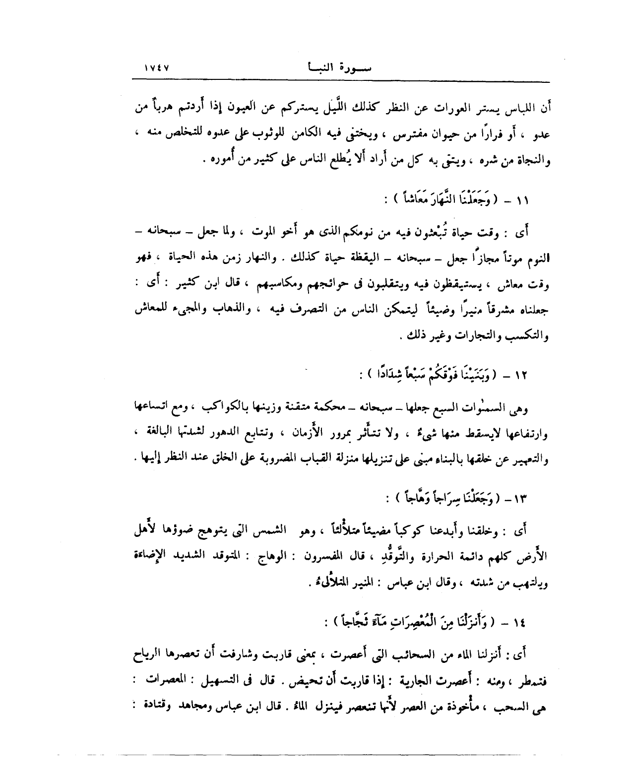 أَي: وقت حياة تُبعثون فيه من نومكم الذي هو أَخو الموت، ولما جعل -سبحانه- النوم موتًا مجازًا جعل -سبحانه- اليقظة حياة كذلك، والنهار زمن هذه الحياة، فهو وقت معاش، يستيقظون فيه ويتقلبون في حوائجهم ومكاسبهم، قال ابن كثير: أَي: جعلناه مشرقًا منيرًا وضيئًا ليتمكن الناس من التصرف فيه، والذهاب والمجيء للمعاش والتكسب والتجارات وغير ذلك.