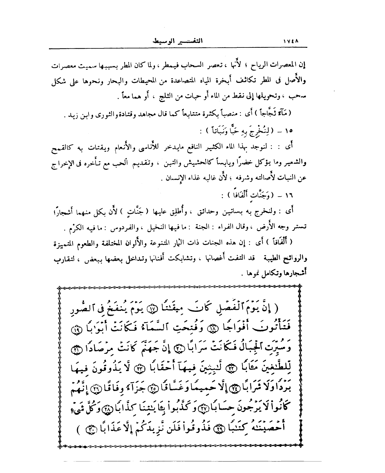 (إِنَّ يَوْمَ الْفَصْلِ كَانَ مِيقَاتًا (17) يَوْمَ يُنفَخُ فِي الصُّورِ فَتَأْتُونَ أَفْوَاجًا (18) وَفُتِحَتْ السَّمَاءُ فَكَانَتْ أَبْوَابًا (19) وَسُيِّرَتْ الْجِبَالُ فَكَانَتْ سَرَابًا (20) إِنَّ جَهَنَّمَ كَانَتْ مِرْصَادًا (21) لِلْطَّاغِينَ مَآبًا (22) لابِثِينَ فِيهَا أَحْقَابًا (23) لا يَذُوقُونَ فِيهَا بَرْدًا وَلا شَرَابًا (24) إِلاَّ حَمِيمًا وَغَسَّاقًا (25) جَزَاءً وِفَاقًا (26) إِنَّهُمْ كَانُوا لا يَرْجُونَ حِسَابًا (27) وَكَذَّبُوا بِآيَاتِنَا كِذَّابًا (28) وَكُلَّ شَيْءٍ أَحْصَيْنَاهُ كِتَابًا (29) فَذُوقُوا فَلَنْ نَزِيدَكُمْ إِلاَّ عَذَابًا (30))