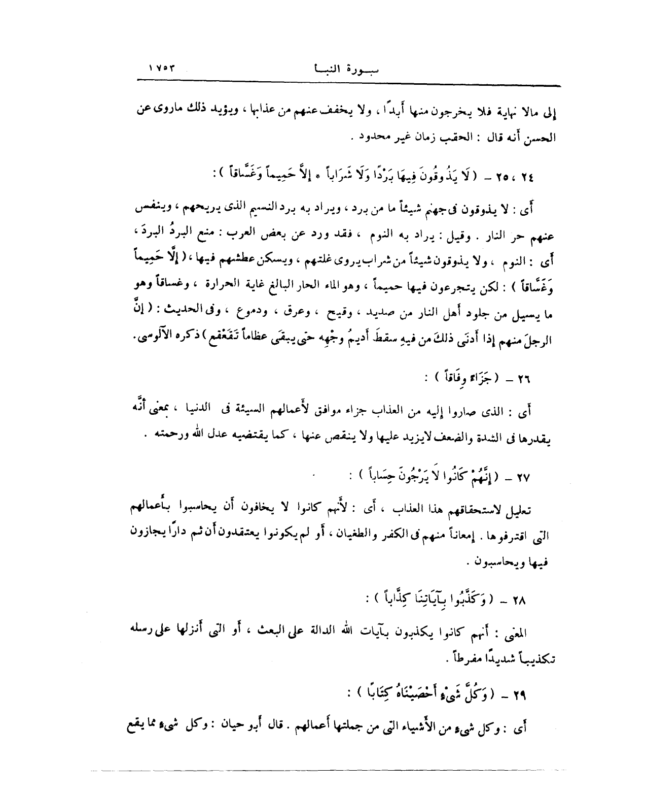 أَي: لا يذوقون في جنهم شيئاً ما من برد، ويراد به برد النسيم الذي يريحهم، وينفس عنهم حر النار وقيل: يراد به النوم، فقد ورد عن بعض العرب: منه البردُ البردَ، أَي: النوم، ولا يذوقون شيئًا من شراب يروى غلتهم، ويسكن عطشهم فيها، (إِلاَّ حَمِيمًا وَغَسَّاقًا): لكن يتجرعون فيها حميمًا، وهو الماء الحار البالغ غاية الحرارة، وغساقًا وهو ما يسيل من جلود أهل النار من صديد، وقيح، وعرق، ودموع، وفي الحديث: (إِنَّ الرجلَ منهم إِذا أَدنَى ذلكَ من فيهِ سقطَ أَديمُ وجْهِه حتى يبقَى عظامًا تَقَعْقع) ذكره الآلوسي.