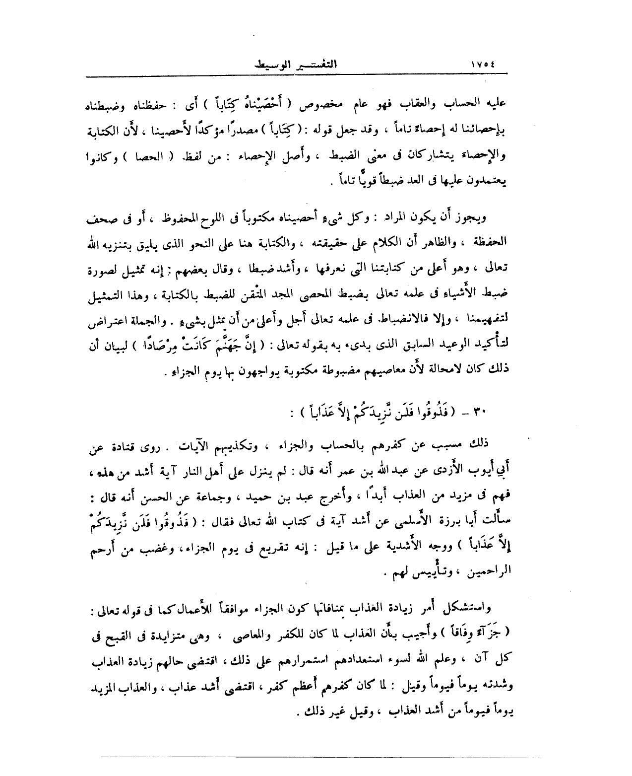 عليه الحساب والعقاب فهو عام مخصوص (أَحْصَيْنَاهُ كِتَابًا) أَي: حفظناه وضبطناه بإِحصائنا له إِحصاءً تامًا، وقد جعل قوله: (كِتَابًا) مصدرًا مؤكدًا لأَحصينا، لأَن الكتابة والإِحصاءِ يتشاركان في معنى الضبط، وأَصل الإِحصاء: من لفظ (الحصا) وكانوا يعتمدون عليها في العد ضبطًا قويًّا تامًّا.
