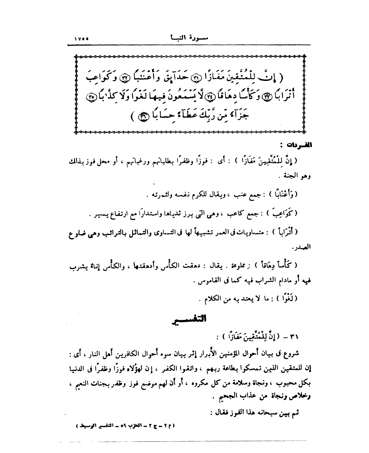 (إِنَّ لِلْمُتَّقِينَ مَفَازًا): أَي: فوزًا وظفرًا بطلباتهم ورغباتهم، أو محل فوز بذلك وهو الجنة.