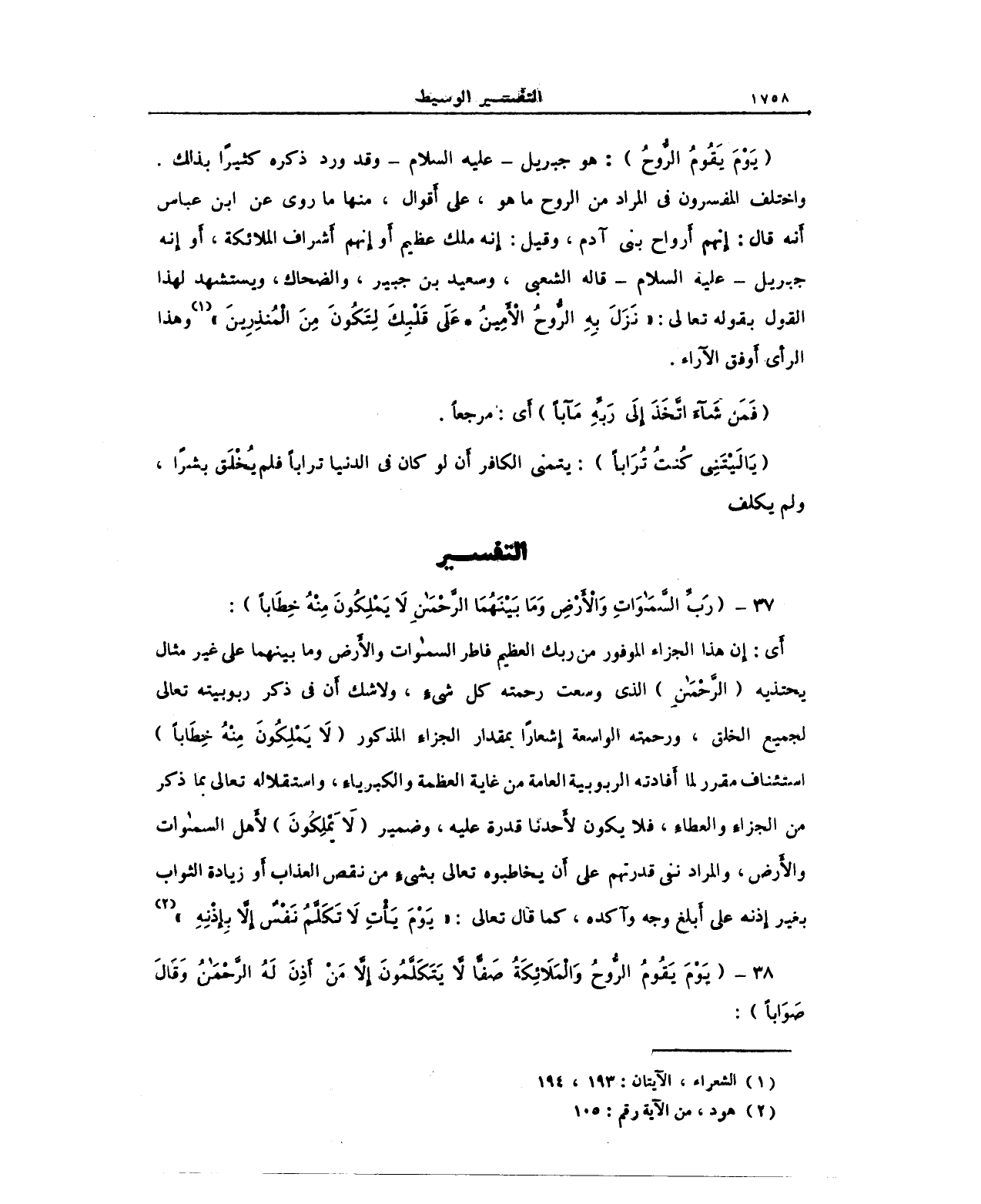(يَوْمَ يَقُومُ الرُّوحُ): هو جبريل - عليه السلام - وقد ورد ذكره كثيرًا بذلك. واختلف المفسرون في المراد من الروح ما هو، على أَقوال، منها ما روي عن ابن عباس أَنه قال: إِنهم أَرواح بني آدم، وقيل: إنه ملك عظيم أَو إِنهم أَشراف الملائكة، أَو أَنه جبريل - عليه السلام - قال الشعبي، وسعيد بن جبير، والضحاك، ويستشهد لهذا القول بقوله تعالى: "نَزَلَ بِهِ الرُّوحُ الأَمِينُ * عَلَى قَلْبِكَ لِتَكُونَ مِنْ الْمُنذِرِينَ) (¬1) وهذا الرأَي أَوفق الآراء.
