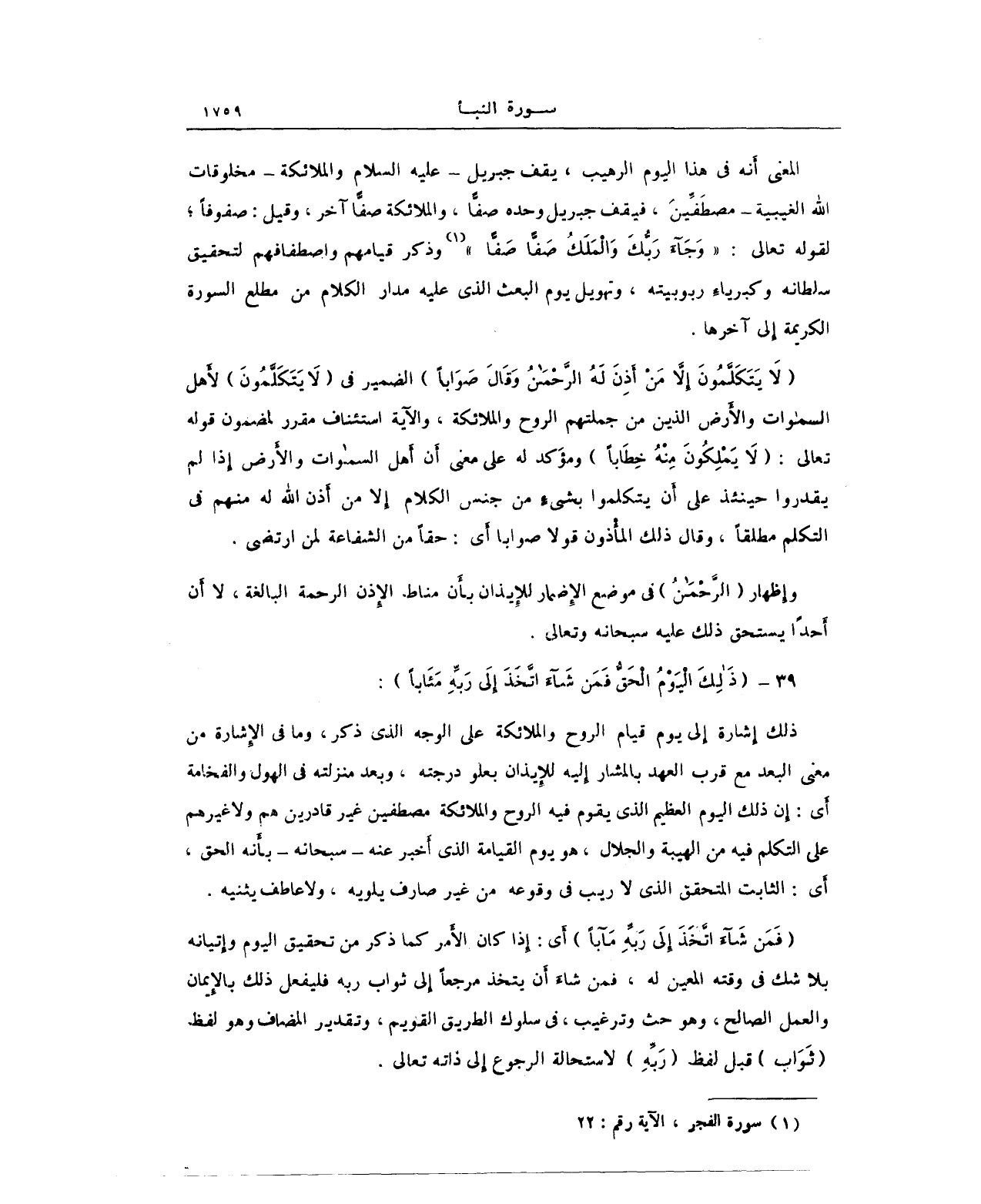 المعنى أَنه في هذا اليوم الرهيب، يقف جبريل - عليه السلام والملائكة - مخلوقات الله الغيبية -مصطَفِّينَ، فيقف جبريل وحده صفًّا، والملائكة صفًّا آخر، وقيل: صفوفًا؛ لقوله تعالى: "وَجَاءَ رَبُّكَ وَالْمَلَكُ صَفًّا صَفًّا" (¬1) وذكر قيامهم واصطفافهم لتحقيق سلطانه وكبرياءِ ربوبيته، وتهويل يوم البعث الذي عليه مدار الكلام من مطلع السورة الكريمة إِلى آخرها.
