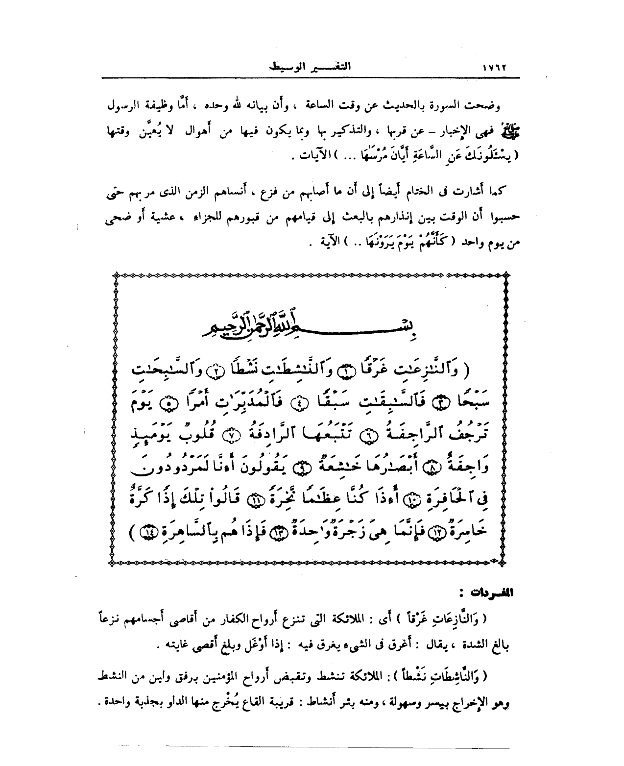 (وَالنَّازِعَاتِ غَرْقًا) أَي: الملائكة التي تنزع أَرواح الكفار من أَقاصي أَجسامهم نزعًا بالغ الشدة، يقال: أَغرق في الشيءِ يغرق فيه: إِذا أَوْغَل وبلغ أَقصى غايته.