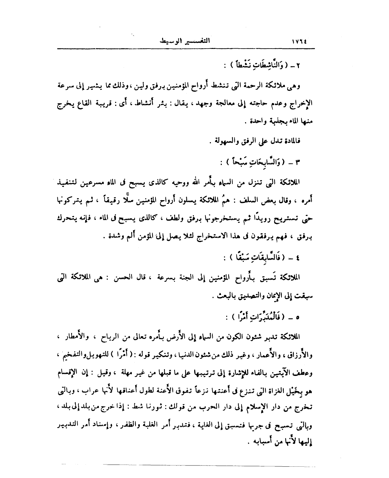 الملائكة تدبر شئون الكون من السماءِ إِلى الأَرض بأَمره تعالى من الرياح، والأَمطار، والأَرزاق، والأَعمار، وغير ذلك من شئون الدنيا، وتنكير قوله: (أَمْرًا) للتهويل والتفخيم، وعطف الآيتين بالفاء للإِشارة إِلى ترتيبها على ما قبلها من غير مهلة، وقيل: إِن الإِقسام هو بِخَيْل الغزاة التي تنزع في أَعنتها نزعًا تفوق الأَعنة لطول أَعناقها لأَنها عراب، وبالتي تخرج من دار الإِسلام إِلى دار الحرب من قولك: ثورنا شط: إِذا خرج من بلد إِلى بلد، وبالتي تسبح في جريها فتسبق إِلى الغاية، فتدبر أَمر الغلبة والظفر، وإِسناد أَمر التدبير إليها لأَنها من أَسبابه.