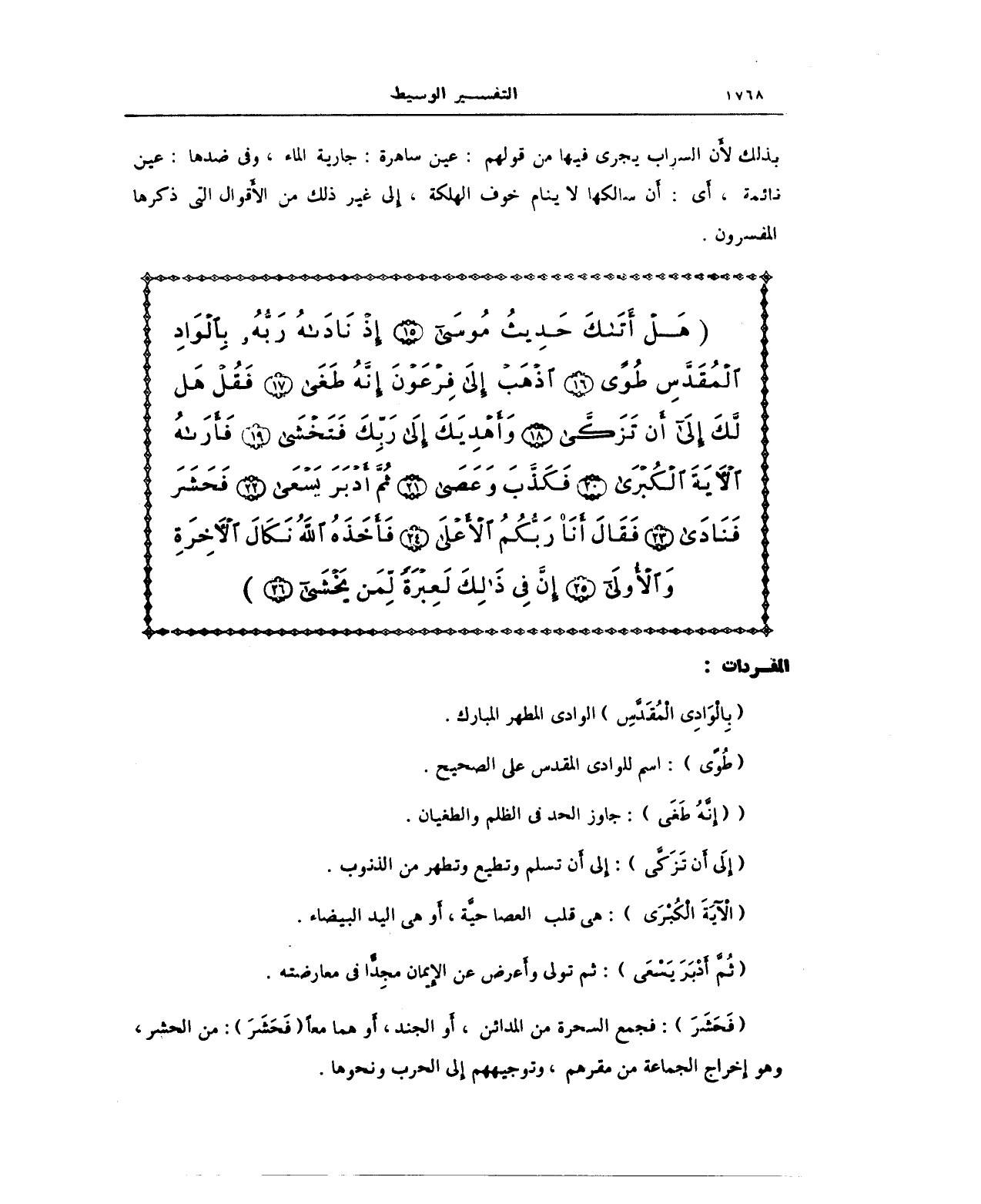 (هَلْ أتَاكَ حَدِيثُ مُوسَى (15) إِذْ نَادَاهُ رَبُّهُ بِالْوَادِي الْمُقَدَّسِ طُوًى (16) اذْهَبْ إِلَى فِرْعَوْنَ إِنَّهُ طَغَى (17) فَقُلْ هَلْ لَكَ إِلَى أَنْ تَزَكَّى (18) وَأَهْدِيَكَ إِلَى رَبِّكَ فَتَخْشَى (19) فَأَرَاهُ الآيَةَ الْكُبْرَى (20) فَكَذَّبَ وَعَصَى (21) ثُمَّ أَدْبَرَ يَسْعَى (22) فَحَشَرَ فَنَادَى (23) فَقَالَ أَنَا رَبُّكُمْ الأَعْلَى (24) فَأَخَذَهُ اللَّهُ نَكَالَ الآخِرَةِ وَالأُولَى (25) إِنَّ فِي ذَلِكَ لَعِبْرَةً لِمَنْ يَخْشَى (26))