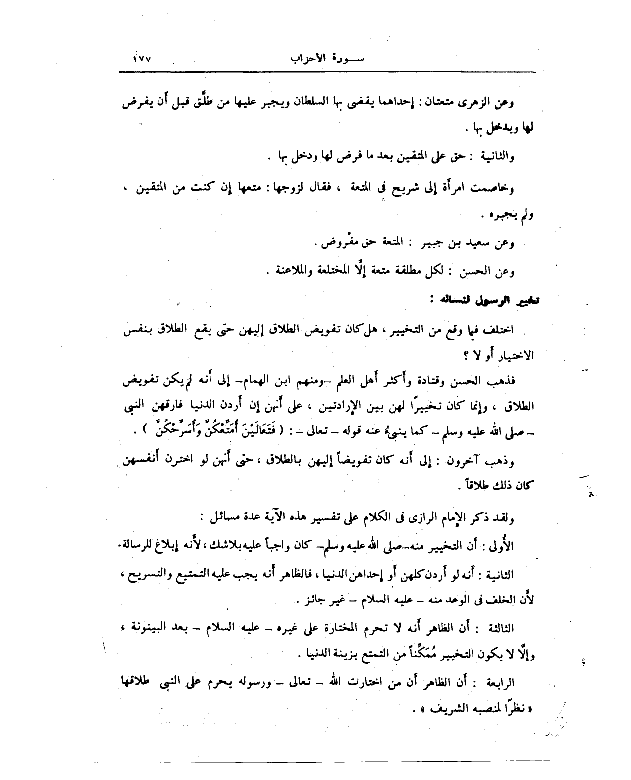 فذهب الحسن وقتادة وأكثر أهل العلم - ومنهم ابن الهمام - إلى أنه لم يكن تفويض الطلاق، وإنما كان تخييرًا لهن بين الإرادتين، على أنهن لمن أردن الدنيا فارقهن النبي - صلى الله عليه وسلم - كما ينبئُ عنه قوله - تعالى -: {فَتَعَالَيْنَ أُمَتِّعْكُنَّ وَأُسَرِّحْكُنَّ}.