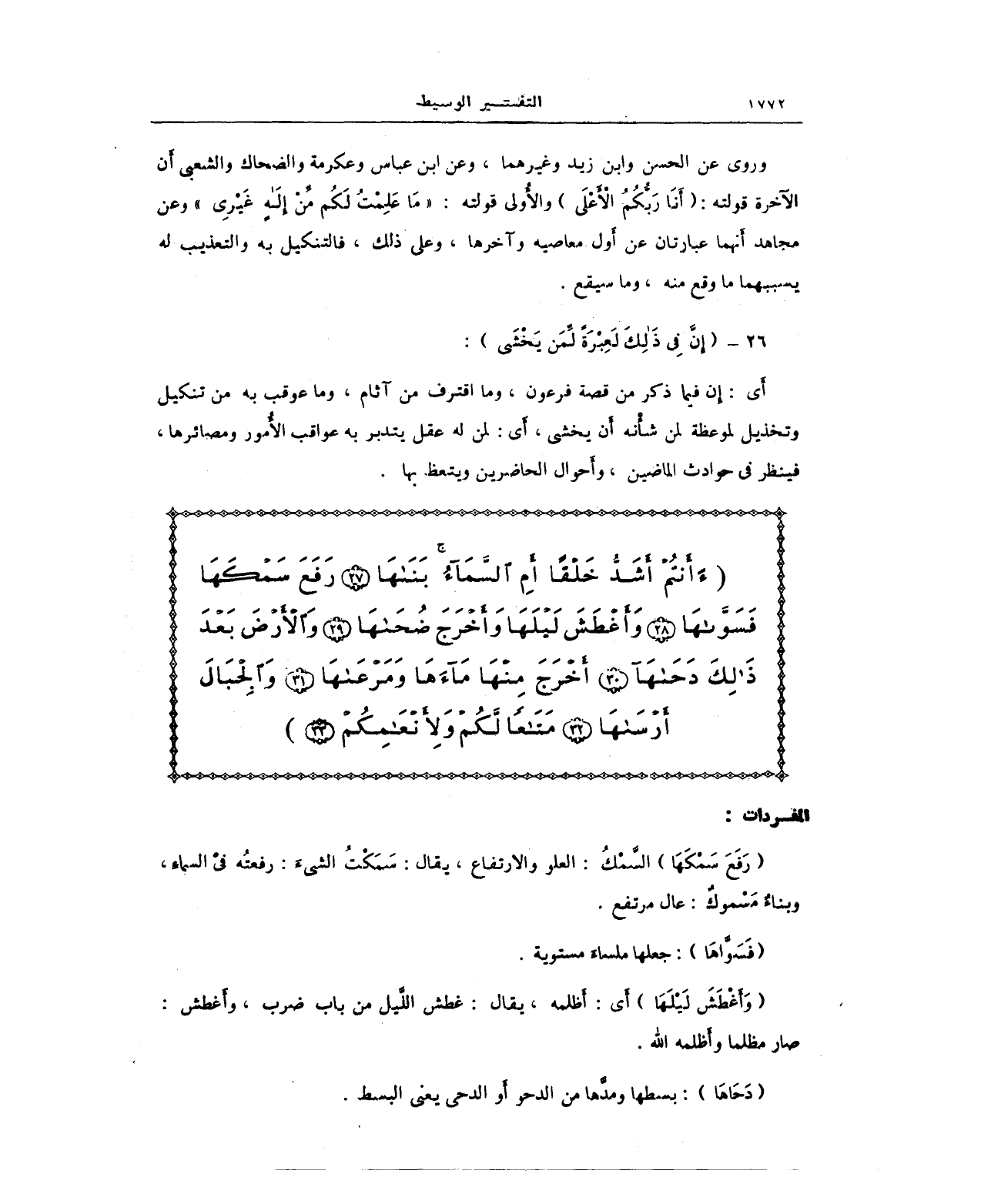 (أَأَنْتُمْ أَشَدُّ خَلْقًا أَمْ السَّمَاءُ بَنَاهَا (27) رَفَعَ سَمْكَهَا فَسَوَّاهَا (28) وَأَغْطَشَ لَيْلَهَا وَأَخْرَجَ ضُحَاهَا (29) وَالأَرْضَ بَعْدَ ذَلِكَ دَحَاهَا (30) أَخْرَجَ مِنْهَا مَاءَهَا وَمَرْعَاهَا (31) وَالْجِبَالَ أَرْسَاهَا (32) مَتَاعًا لَكُمْ وَلأَنْعَامِكُمْ (33))