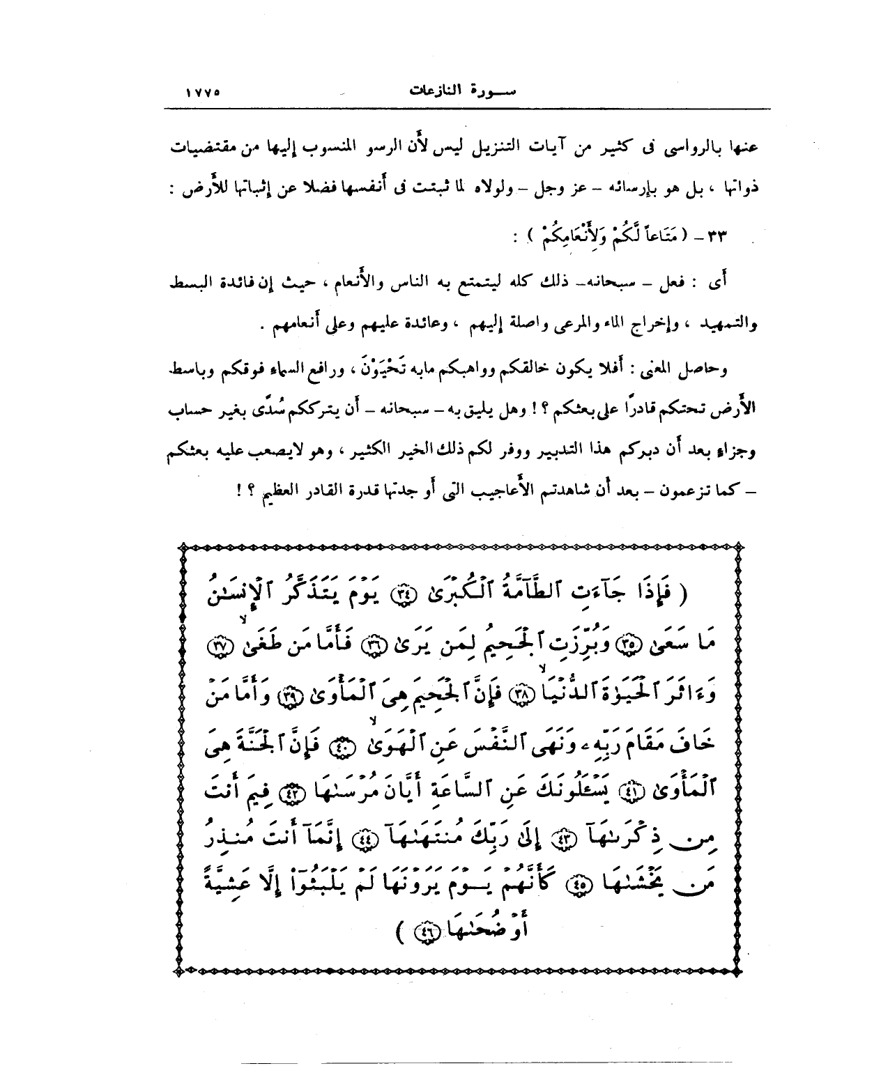 (فَإِذَا جَاءَتِ الطَّامَّةُ الْكُبْرَى (34) يَوْمَ يَتَذَكَّرُ الْإِنْسَانُ مَا سَعَى (35) وَبُرِّزَتِ الْجَحِيمُ لِمَنْ يَرَى (36) فَأَمَّا مَنْ طَغَى (37) وَآثَرَ الْحَيَاةَ الدُّنْيَا (38) فَإِنَّ الْجَحِيمَ هِيَ الْمَأْوَى (39) وَأَمَّا مَنْ خَافَ مَقَامَ رَبِّهِ وَنَهَى النَّفْسَ عَنِ الْهَوَى (40) فَإِنَّ الْجَنَّةَ هِيَ الْمَأْوَى (41) يَسْأَلُونَكَ عَنِ السَّاعَةِ أَيَّانَ مُرْسَاهَا (42) فِيمَ أَنْتَ مِنْ ذِكْرَاهَا (43) إِلَى رَبِّكَ مُنْتَهَاهَا (44) إِنَّمَا أَنْتَ مُنْذِرُ مَنْ يَخْشَاهَا (45) كَأَنَّهُمْ يَوْمَ يَرَوْنَهَا لَمْ يَلْبَثُوا إِلَّا عَشِيَّةً أَوْ ضُحَاهَا (46))