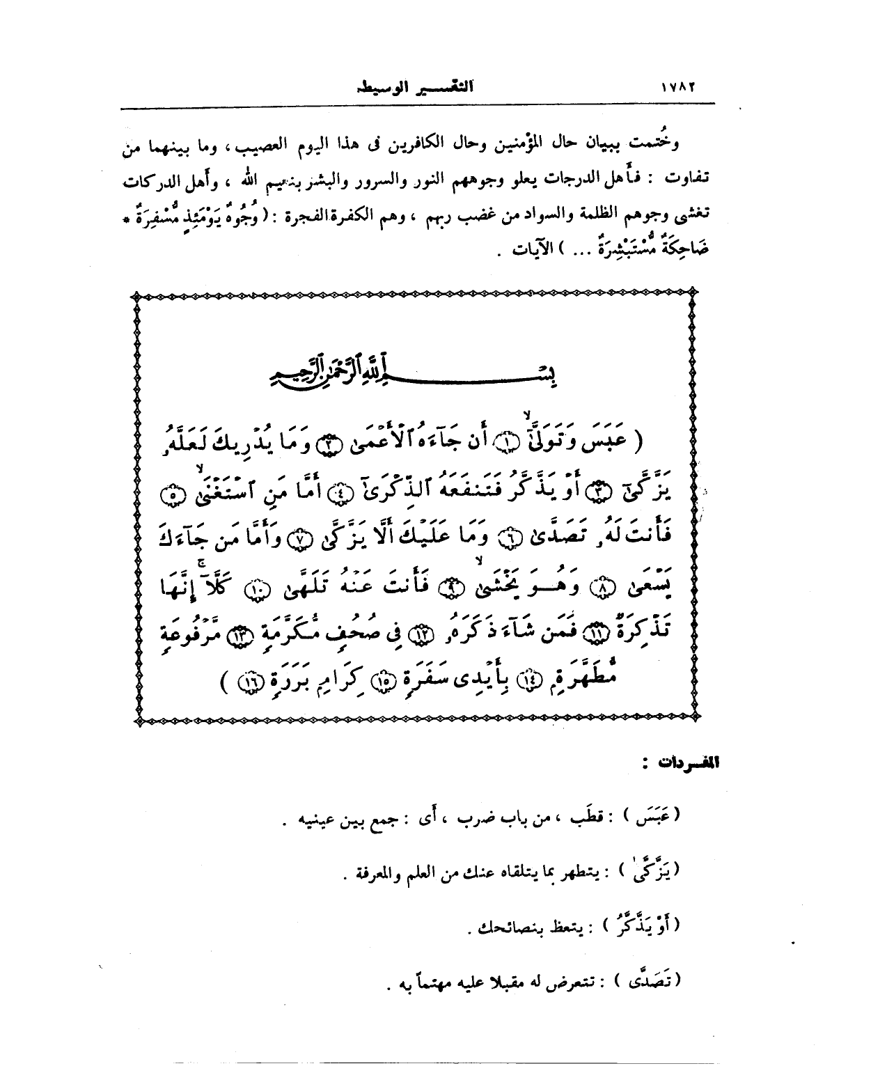 {عَبَسَ وَتَوَلَّى (1) أَنْ جَاءَهُ الْأَعْمَى (2) وَمَا يُدْرِيكَ لَعَلَّهُ يَزَّكَّى (3) أَوْ يَذَّكَّرُ فَتَنْفَعَهُ الذِّكْرَى (4) أَمَّا مَنِ اسْتَغْنَى (5) فَأَنْتَ لَهُ تَصَدَّى (6) وَمَا عَلَيْكَ أَلَّا يَزَّكَّى (7) وَأَمَّا مَنْ جَاءَكَ يَسْعَى (8) وَهُوَ يَخْشَى (9) فَأَنْتَ عَنْهُ تَلَهَّى (10) كَلَّا إِنَّهَا تَذْكِرَةٌ (11) فَمَنْ شَاءَ ذَكَرَهُ (12) فِي صُحُفٍ مُكَرَّمَةٍ (13) مَرْفُوعَةٍ مُطَهَّرَةٍ (14) بِأَيْدِي سَفَرَةٍ (15) كِرَامٍ بَرَرَةٍ (16)}