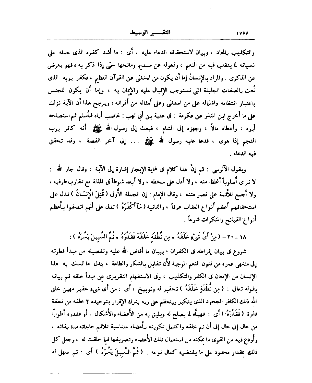 شروع في بيان إفراطه في الكفران؛ ببيان ما أفاض الله عليه وتفصيله من مبدأ فطرته إلى منتهى عمره من فنون النعم الموجبة لأن تقابل بالشكر والطاعة، بدل ما تمسك به هذا الإنسان من الإمعان في الكفر والتكذيب، وفي الاستفهام التقريري عن مبدأ خلقه ثم بيانه بقوله تعالى: (من نطفة خلقه) تحقير له وتوبيخ، أي: من أي شيءٍ حقير مهين خلق الله ذلك الكافر الجحود الذي يتكبر ويتعظم على ربه بترك الإقرار بتوحيده؟ خلقه من نطفة قذرة (فَقَدَّرَه) أي: فهيأَه لما يصلح له ويليق به من الأَعضاء والأشكال، أو فقدره أطوارًا من حال إلى حال إلى أن تم خلقه واكتمل تكوينه بأعضاء متناسبة تلائم حاجاته مدة بقائه، وأَودع فيه من القوى ما يمكنه من استعمال تلك الأعضاء وتصريفها فيما خلقت له، وجعل كل ذلك بمقدار محدود على ما يقتضيه كمال نوعه. (ثُم السَّبيل يَسَّره) أي: ثم سهل له