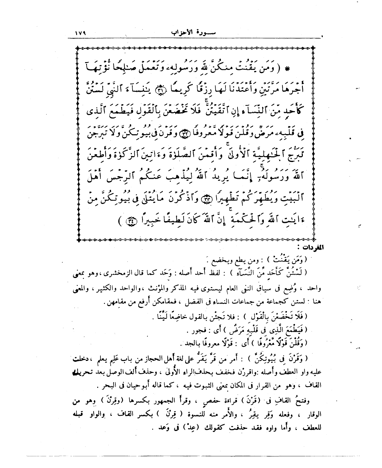 {وَمَنْ يَقْنُتْ مِنْكُنَّ لِلَّهِ وَرَسُولِهِ وَتَعْمَلْ صَالِحًا نُؤْتِهَا أَجْرَهَا مَرَّتَيْنِ وَأَعْتَدْنَا لَهَا رِزْقًا كَرِيمًا (31) يَا نِسَاءَ النَّبِيِّ لَسْتُنَّ كَأَحَدٍ مِنَ النِّسَاءِ إِنِ اتَّقَيْتُنَّ فَلَا تَخْضَعْنَ بِالْقَوْلِ فَيَطْمَعَ الَّذِي فِي قَلْبِهِ مَرَضٌ وَقُلْنَ قَوْلًا مَعْرُوفًا (32) وَقَرْنَ فِي بُيُوتِكُنَّ وَلَا تَبَرَّجْنَ تَبَرُّجَ الْجَاهِلِيَّةِ الْأُولَى وَأَقِمْنَ الصَّلَاةَ وَآتِينَ الزَّكَاةَ وَأَطِعْنَ اللَّهَ وَرَسُولَهُ إِنَّمَا يُرِيدُ اللَّهُ لِيُذْهِبَ عَنْكُمُ الرِّجْسَ أَهْلَ الْبَيْتِ وَيُطَهِّرَكُمْ تَطْهِيرًا (33) وَاذْكُرْنَ مَا يُتْلَى فِي بُيُوتِكُنَّ مِنْ آيَاتِ اللَّهِ وَالْحِكْمَةِ إِنَّ اللَّهَ كَانَ لَطِيفًا خَبِيرًا (34)}.