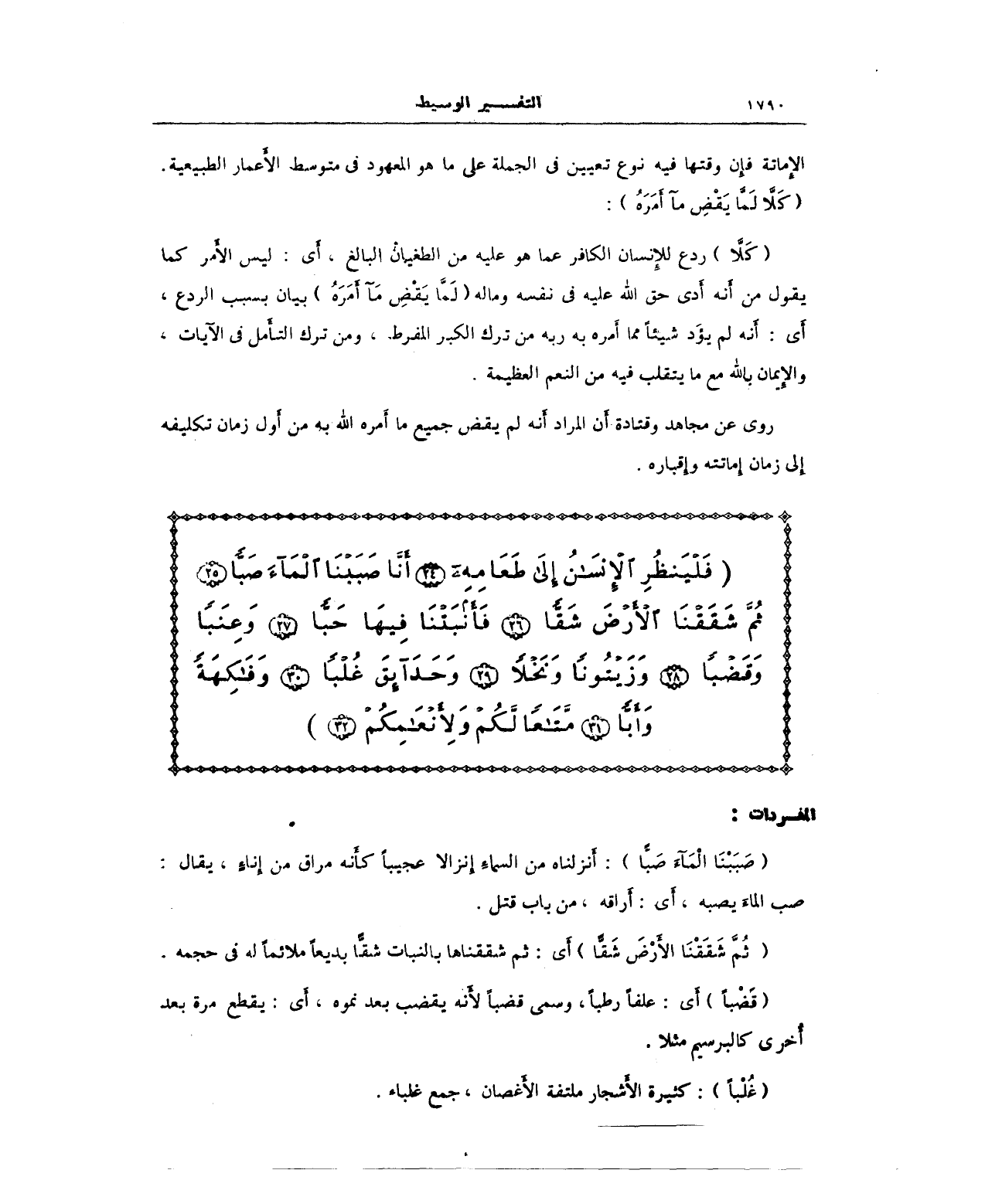 {فَلْيَنْظُرِ الْإِنْسَانُ إِلَى طَعَامِهِ (24) أَنَّا صَبَبْنَا الْمَاءَ صَبًّا (25) ثُمَّ شَقَقْنَا الْأَرْضَ شَقًّا (26) فَأَنْبَتْنَا فِيهَا حَبًّا (27) وَعِنَبًا وَقَضْبًا (28) وَزَيْتُونًا وَنَخْلًا (29) وَحَدَائِقَ غُلْبًا (30) وَفَاكِهَةً وَأَبًّا (31) مَتَاعًا لَكُمْ وَلِأَنْعَامِكُمْ (32)}