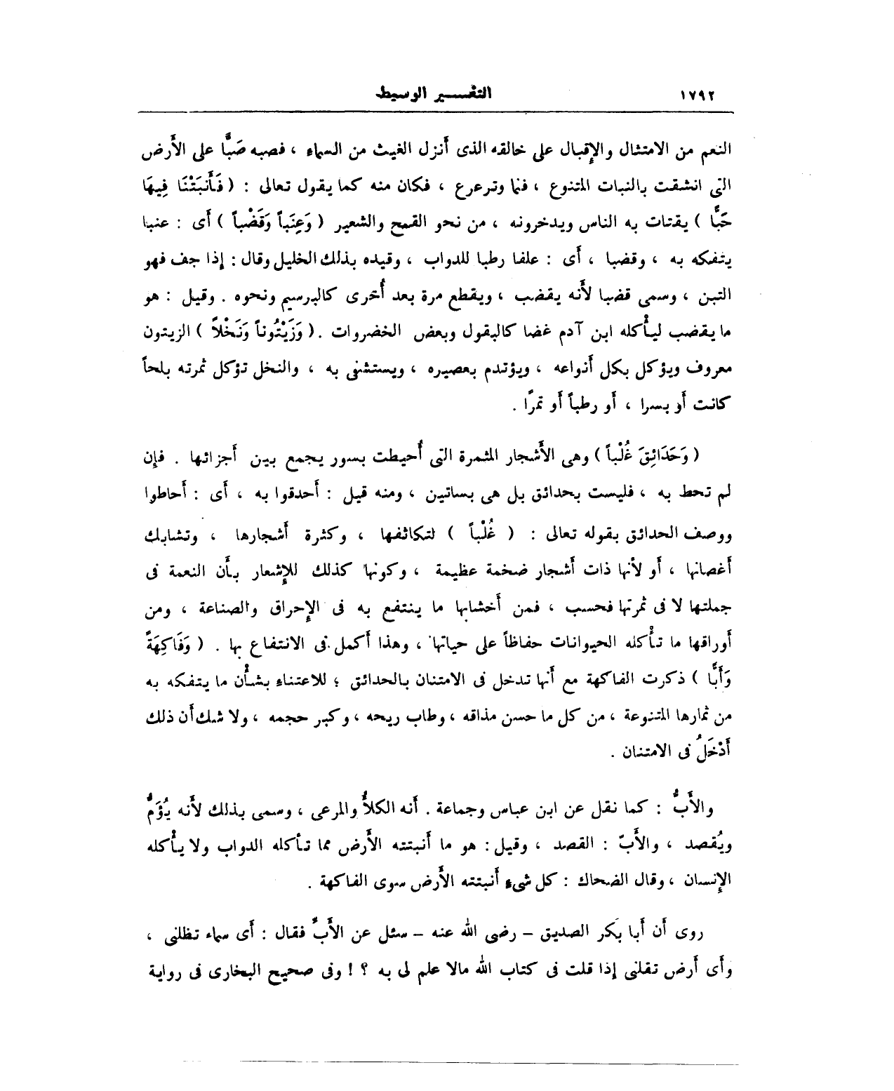 (وحَدَائِقَ غُلْبًا) وهي الأشجار المثمرة التي أُحيطت بسور يجمع بين أجزائها. فإن لم تحط به، فليست بحدائق بل هي بساتين، ومنه قيل: أحدقوا به، أي: أحاطوا ووصف الحدائق بقوله تعالى: (غُلْبًا) لتكاثفها، وكثرة أشجارها، وتشابك أغصانها، أو لأنها ذات أشجار ضخمة عظيمة، وكونها كذلك للإشعار بأَن النعمة في جملتها لا في ثمرتها فحسب، فمن أخشابها ما ينتفع به في الإحراق والصناعة، ومن أوراقها ما تأكله الحيوانات حفاظاً على حياتها، وهذا أكمل في الانتفاع بها. (وفاكهة وأبًّا) ذكرت الفاكهة مع أنها تدخل في الامتنان بالحدائق؛ للاعتناء بشأْن ما يتفكه به من ثمارها المتنوعة، من كل ما حسن مذاقه، وطاب ريحه، وكبر حجمه، ولا شك أن ذلك أَدْخَلُ في الامتنان.
