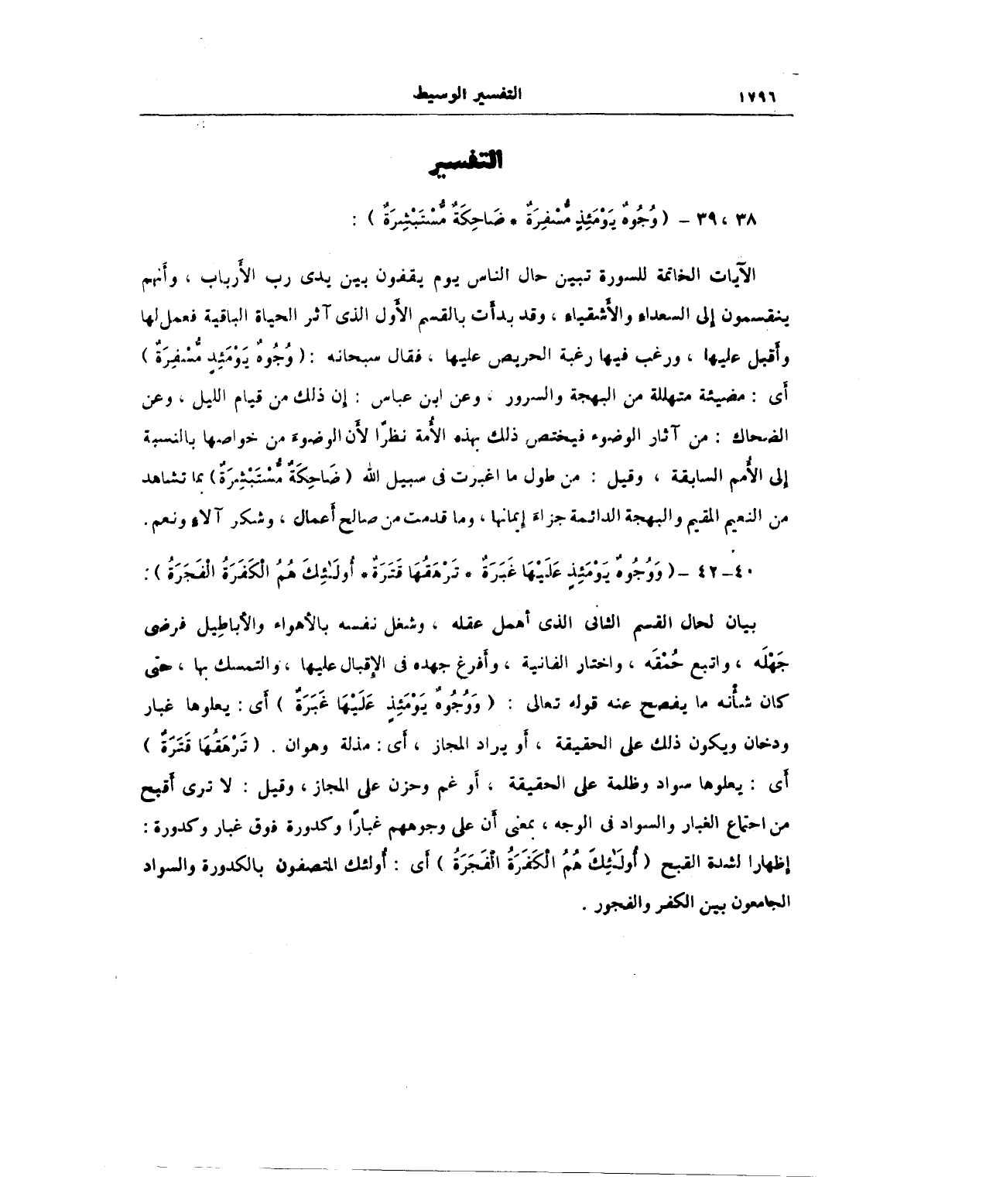 الآيات الخاتمة للسورة تبين حال الناس يوم يقفون بين يدي رب الأَرباب، وأَنهم ينقسمون إِلى السعداءِ والأَشقياءِ، وقد بدأَت بالقسم الأَول الذي آثر الحياة الباقية فعمل لها وأَقبل عليها، ورغب فيها رغبة الحريص عليها، فقال سبحانه: (وُجُوهٌ يَوْمَئِذٍ مُسْفِرَةٌ) أَي: مضيئة متهللة من البهجة والسرور، وعن ابن عباس: إِن ذلك من قيام الليل، وعن الضحاك: من آثار الوضوء فيختص ذلك بهذه الأُمة نظرًا لأَن الوضوءَ من خواصها بالنسبة إِلى الأُمم السابقة، وقيل: من طول ما اغبرت في سبيل الله (ضَاحِكَةٌ مُسْتَبْشِرَةٌ) بما تشاهد من النعيم المقيم والبهجة الدائمة جزاءَ إِيمانها، وما قدمت من صالح أَعمال، وشكر آلاءِ ونعم.