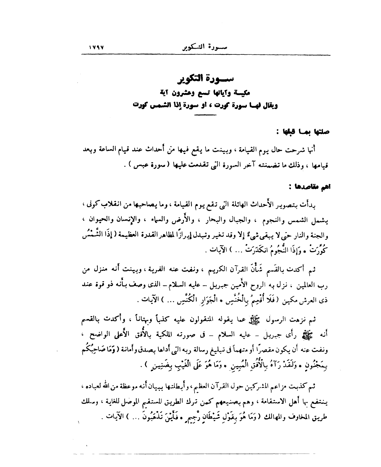 بدأت بتصوير الأحداث الهائلة التي تقع يوم القيامة، وما يصاحبها من انقلاب كوني، يشمل الشمس والنجوم، والجبال والبحار، والأَرض والسماء، والإنسان والحيوان، والجنة والنار حتى لا يبقى شيءٌ إلا وقد تغير وتبدل إيرازًا لمظاهر القدرة العظيمة (إذَا الشَّمس كُوِّرَت * وَإِذَا النُّجُوم انكَدَرتْ .. ) الآيات.