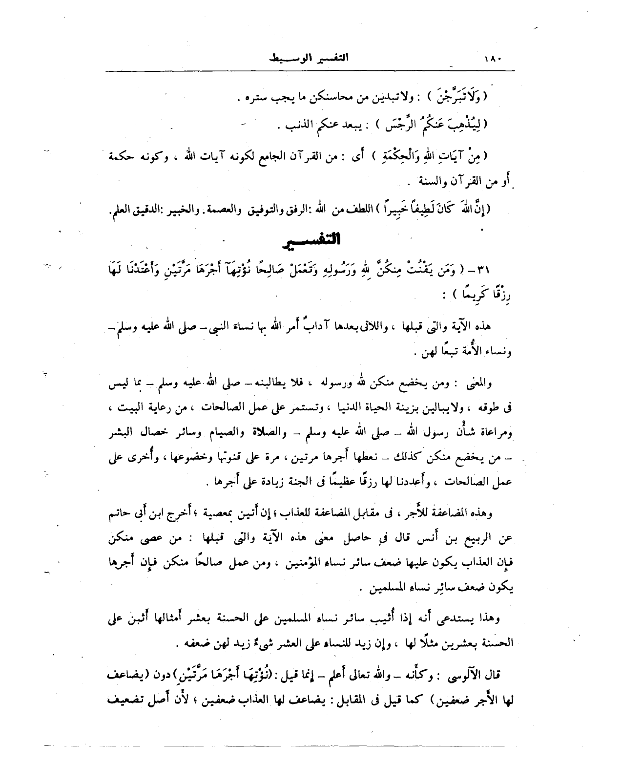 31 - {وَمَنْ يَقْنُتْ مِنْكُنَّ لِلَّهِ وَرَسُولِهِ وَتَعْمَلْ صَالِحًا نُؤْتِهَا أَجْرَهَا مَرَّتَيْنِ وَأَعْتَدْنَا لَهَا رِزْقًا كَرِيمًا}: