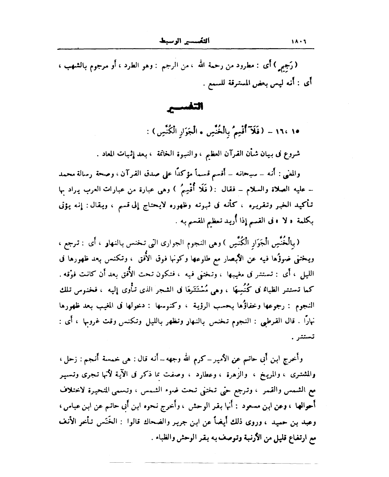 (بِالْخُنَّسِ الْجَوَارِي الْكُنَّسِ) وهي النجوم الجواري التي تخنس بالنهار، أي: ترجع، ويختفي ضوؤُها فيه عن الأبصار مع طلوعها وكونها فوق الأُفق، وتكنس بعد ظهورها في الليل، أي: تستتر في مغيبها، وتخفى فيه، فتكون تحت الأُفق بعد أن كانت فوقه. كما تستتر الظباءُ في كُنُسِها، وهي مُسْتَتَرَهَا في الشجر الذي تأْوي إليه، فخنوس تلك النجوم: رجوعها وخفاؤُها بحسب الرؤية، وكنوسها: دخولها في المغيب بعد ظهورها نهارًا. قال القرطبي: النجوم تخنس بالنهار وتظهر بالليل وتكنس وقت غروبها، أي: تستتر.