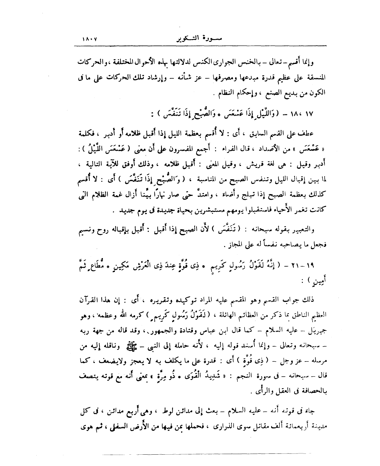 عطف على القسم السابق، أَي: لا أُقسم بعظمة الليل إذا أَقبل ظلامه أَو أَدبر، فكلمة "عَسْعَسَ" من الأضداد، قال الفراء: أَجمع المفسرون على أَن معنى (عَسْعَسَ اللَّيْلُ): أَدبر وقيل: هي لغة قريش، وقيل المعنى: أقبل ظلامه، وذلك أَوفق للآية التالية، لما بين إقبال الليل وتنفس الصبح من المناسبة، (وَالصُّبْحِ إِذَا تَنَفَّسَ) أي: لا أُقسم كذلك بعظمة الصبح إذا تبلج وأَضاءَ، وامتدَّ حتى صار نهارًا بيِّنا أَزال غمة الظلام التي كانت تغمر الأَحياء فاستقبلوا يومهم مستبشرين بحياة جديدة في يوم جديد.