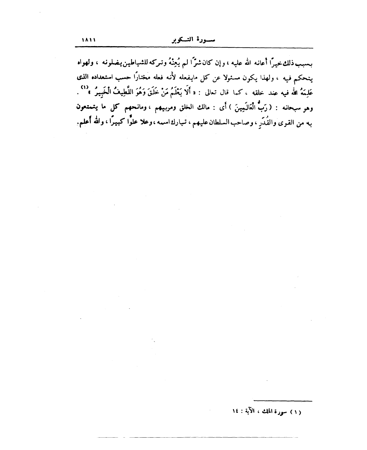 بسبب ذلك خيرًا أعانه الله عليه، وإن كان شرًّا لم يُعِنْهُ وتركه للشياطين يضلونه، ولهواه يتحكم فيه، ولهذا يكون مسئولا عن كل ما يفعله لأنه فعله مختارًا حسب استعداده الذي عَلِمَهُ الله فيه عند خلقه، كما قال تعالى: "أَلا يَعْلَمُ مَنْ خَلَقَ وَهُوَ اللَّطِيفُ الْخَبِيرُ" (¬1).