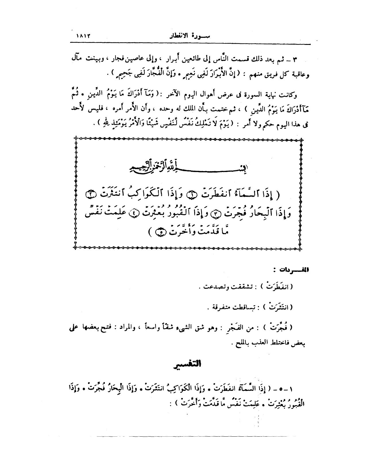 {إِذَا السَّمَاءُ انْفَطَرَتْ (1) وَإِذَا الْكَوَاكِبُ انْتَثَرَتْ (2) وَإِذَا الْبِحَارُ فُجِّرَتْ (3) وَإِذَا الْقُبُورُ بُعْثِرَتْ (4) عَلِمَتْ نَفْسٌ مَا قَدَّمَتْ وَأَخَّرَتْ (5)}