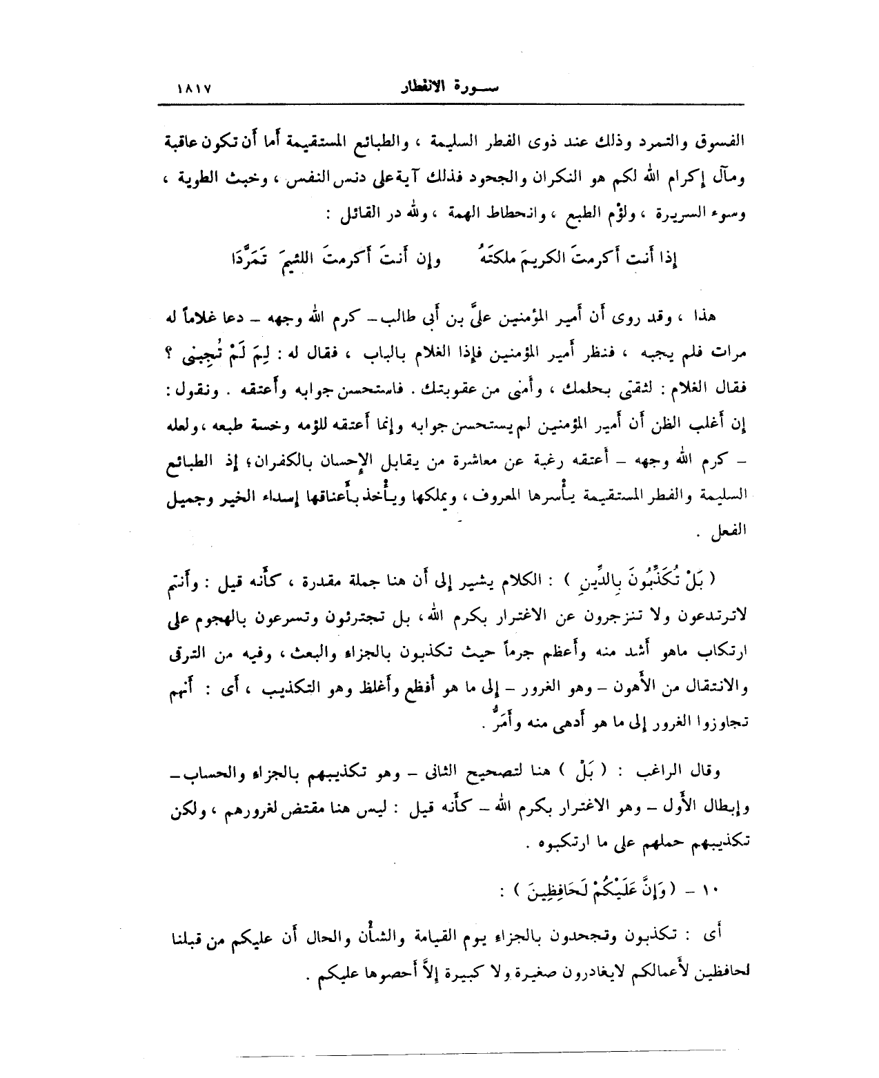 هذا، وقد روي أن أمير المؤمنين عليَّ بن أبي طالب -كرم الله وجهه- دعا غلامًا له مرات فلم يجبه، فنظر أمير المؤمنين فإذا الغلام بالباب، فقال له: لِمَ لَمْ تجِبني؟ فقال الغلام: لثقتي بحلمك، وأمني من عقوبتك. فاستحسن جوابه وأَعتقه. ونقول: إن أغلب الظن أن أمير المؤمنين لم يستحسن جوابه وإنما أعتقه للؤمه وخسة طبعه، ولعله -كرم الله وجهه- أعتقه رغبة عن معاشرة من يقابل الإحسان بالكفران؛ إذ الطبائع السليمة والفطر المستقيمة يأسرها المعروف، ويملكها ويأخذ بأعناقها إسداء الخير وجميل الفعل.