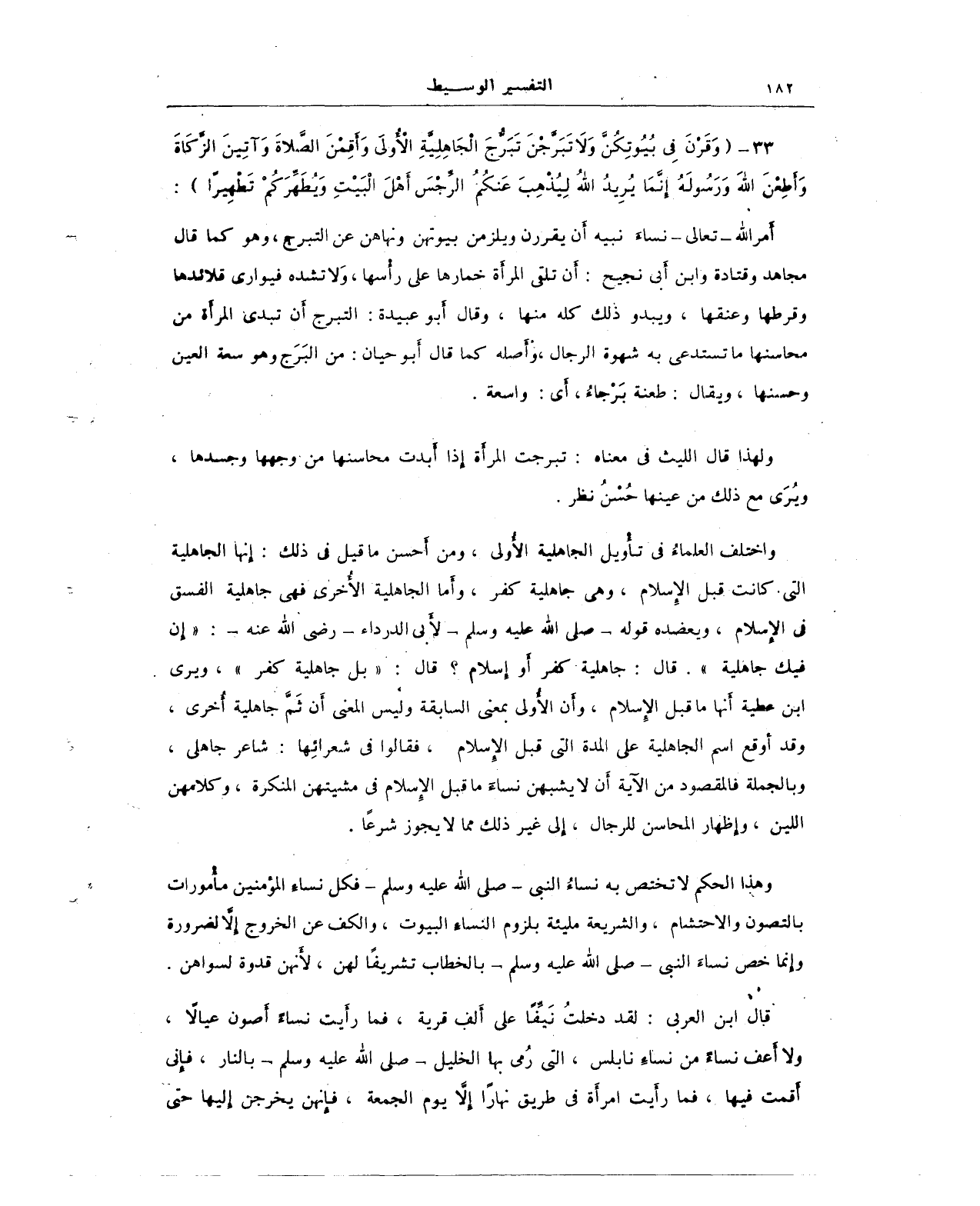 واختلف العلماءُ في تأْويل الجاهلية الأُولى، ومن أحسن ما قيل في ذلك: إنها الجاهلية التي كانت قبل الإِسلام، وهي جاهلية كفر، وأَما الجاهلية الأُخرى فهي جاهلية الفسق في الإِسلام، ويعضده قوله - صلى الله عليه وسلم - لأَبي الدرداء - رضي الله عنه -: "إن فيك جاهلية". قال: جاهلية كفر أَو إسلام؟ قال: "بل جاهلية كفر"، ويرى ابن عطية أَنها ما قبل الإِسلام، وأَن الأُولى بمعنى السابقة وليس المعنى أن ثَمَّ جاهلية أُخرى، وقد أوقع اسم الجاهلية على المدة التي قبل الإِسلام، فقالوا في شعرائِها: شاعر جاهلي، وبالجملة فالمقصود من الآية أن لا يشبهن نساءَ ما قبل الإِسلام في مشيتهن المنكرة، وكلامهن اللين، وإظهار المحاسن للرجال، إلى غير ذلك مما لا يجوز شرعًا.