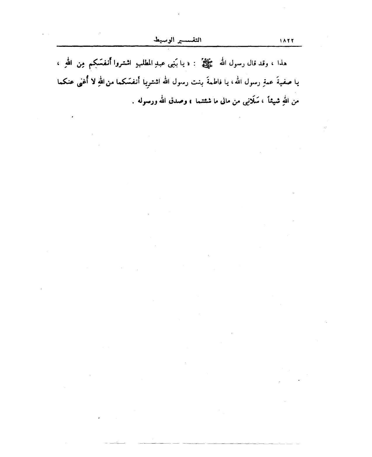 هذا، وقد قال رسول الله صلى الله عليه وسلم: "يا بَنِي عبدِ المطلبِ اشتروا أَنفسَكم مِن اللهِ، يا صفيةَ عمةِ رسول الله، يا فاطمةَ بنت رسول الله اشترِيا أَنفسَكما من اللهِ لا أُغني عنكما من اللهِ شيئًا، سَلاَنِي من مالي ما شئتما" وصدق الله ورسوله.