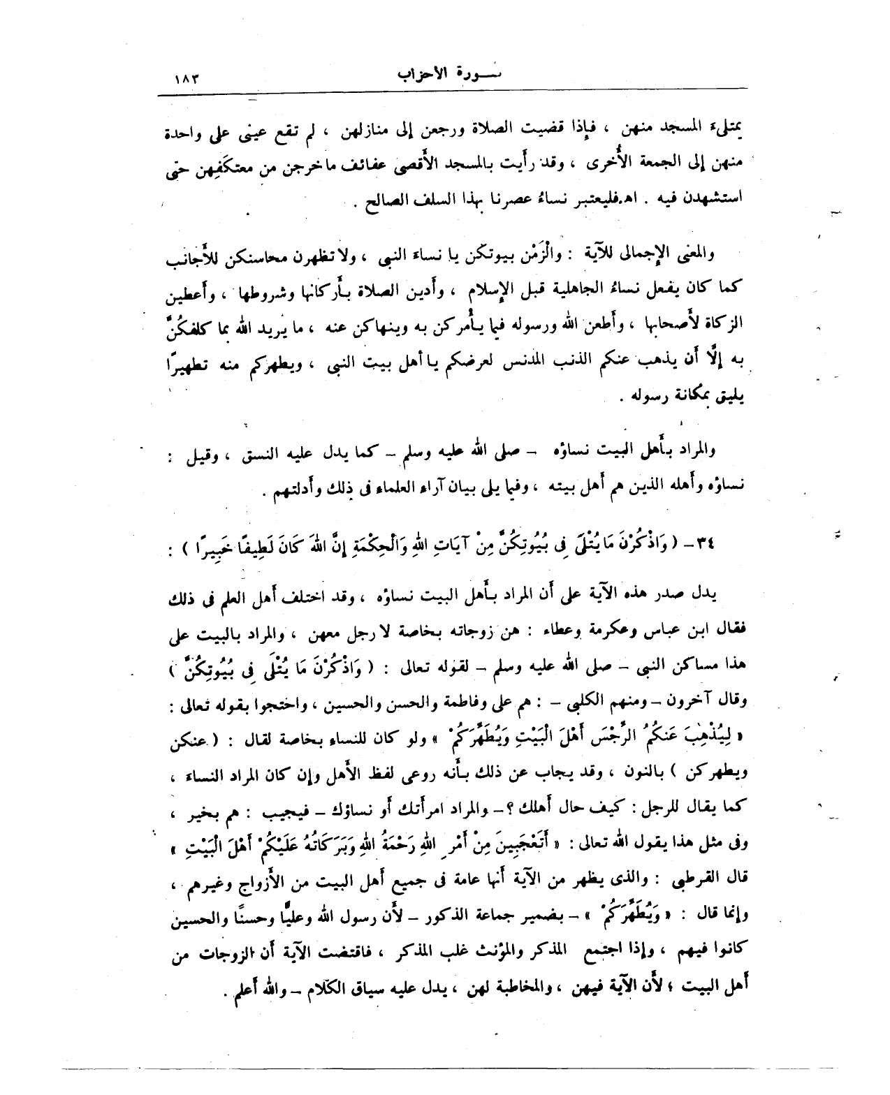 يدل صدر هذه الآية كل أن المراد بأَهل البيت نساؤه، وقد اختلف أهل العلم في ذلك فقال ابن عباس وعكرمة وعطاء: هن زوجاته بخاصة لا رجل معهن، والمراد بالبيت على هذا مساكن النبي - صلى الله عليه وسلم - لقوله تعالى: {وَاذْكُرْنَ مَا يُتْلَى فِي بُيُوتِكُنَّ} وقال آخرون - ومنهم الكلبي -: هم علي وفاطمة والحسن والحسين، واحتجوا بقوله تعالى: {لِيُذْهِبَ عَنْكُمُ الرِّجْسَ أَهْلَ الْبَيْتِ وَيُطَهِّرَكُمْ تَطْهِيرًا} ولو كان للنساء بخاصة لقال: (عنكن ويطهركن) بالنون، وقد يجاب عن ذلك بأَنه روعي لفظ الأَهل وإن كان المراد النساء، كما يقال للرجل: كيف حال أهلك؟ - والمراد امرأتك أو نساؤك - فيجيب: هم بخير، وفي مثل هذا يقول الله تعالى: {أَتَعْجَبِينَ مِنْ أَمْرِ اللَّهِ رَحْمَتُ اللَّهِ وَبَرَكَاتُهُ عَلَيْكُمْ أَهْلَ الْبَيْتِ} قال القرطبي: والذي يظهر من الآية أنها عامة في جميع أهل البيت من الأزواج وغيرهم، وإنما قال: {وَيُطَهِّرَكُمْ} - بضمير جماعة المذكور - لأَن رسول الله وعليًّا وحسنًا والحسين كانوا فيهم، وإذا اجتمع المذكر والمؤنث غلب المذكر، فاقتضت الآية أن الزوجات من أهل البيت؛ لأَن الآية فيهن، والمخاطبة لهن، يدل عليه سياق الكلام - والله أعلم.