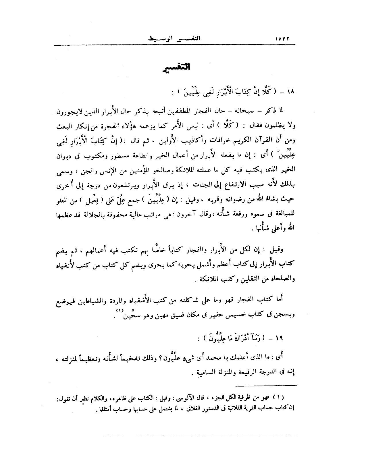 لما ذكر -سبحانه- حال الفجار المطففين أَتبعه بذكر حال الأَبرار الذين لا يجورون ولا يظلمون فقال: (كَلاَّ) أَي: ليس الأَمر كما يزعمه هؤُلاءِ الفجرة من إِنكار البعث ومن أَن القرآن الكريم خرافات وأَكاذيب الأَولين، ثم قال: (إِنَّ كِتَابَ الأَبْرَارِ لَفِي عِلِّيِّينَ) أَي: إِن ما يفعله الأَبرار من أعمال الخير والطاعة مسطور ومكتوب في ديوان الخير الذي يكتب فيه كل ما عملته الملائكة وصالحو المؤمنين من الإِنس والجن، وسمي بذلك لأَنه سبب الارتفاع إِلى الجنات؛ إِذ يرقى الأَبرار ويرتفعون من درجة إِلى أُخرى حيث يشاءُ الله من رضوانه وقربه، وقيل: إن (عِلِّيِّينَ) جمع عِلِّيّ عَلى (فِعِّيل) من العلو للمبالغة في سموه ورفعة شأْنه، وقال آخرون: هي مراتب عالية محفوفة بالجلالة قد عظمها الله وأَعلى شأْنها.