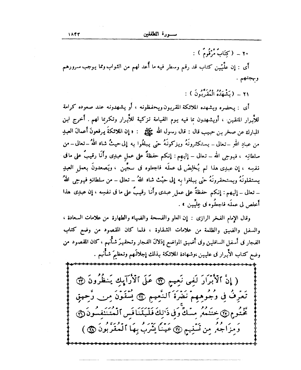 أَي: يحضره ويشهده الملائكة المقربون ويحفظونه، أَو يشهدونه عند صعوده كرامة للأَبرار المتقين، أَو يشهدون بما فيه يوم القيامة تزكية للأبرار وتكريما لهم. أَخرج ابن المبارك عن صخر بن حبيب قال: قال رسول الله صلى الله عليه وسلم: إِن الملائكةَ يرفعون أَعمالَ العبدِ من عباد الله - تعالى - يستكثرونَهُ حتى يبلغُوا به إِلى حيثُ شاءَ اللهُ - تعالى - من سلطانه، فيوحِي الله - تعالى- إِليهم: إنكم حفظةٌ على عمل عبدِي وأَنَا رقيبٌ على ما في نفسه، إِن عبدِي هذا لم يُخِلصْ لي عملَه فاجعلوه في سجِّين، ويَصعدونَ بعمل العبدِ يستقلونَهُ ويستحقرونَهُ حتى يبلغوا بِه إِلى حيْث شاءَ الله - تعالى - من سلطانهِ فيوحِي اللهُ - تعالى - إِليهم: إِنكم حفظةٌ على عملِ عبدي وأنا رقيبٌ على ما في نفسه، إِن عبدِي هذا أَخلص لي عمله فاجعلوه في عِلِّيين".