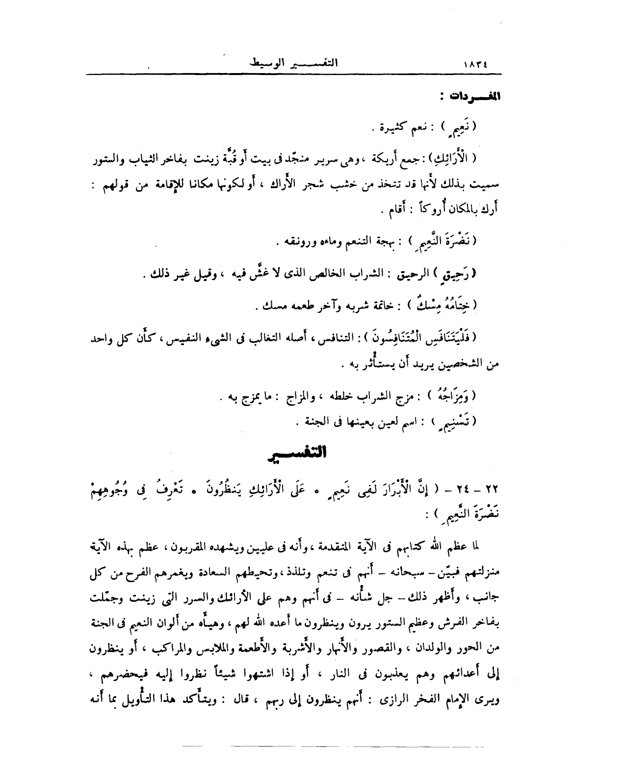 لما عظم الله كتابهم في الآية المتقدمة، وأَنه في عليين ويشهده المقربون، عظم بهذه الآية منزلتهم فبيّن -سبحانه- أَنهم في تنعيم وتلذذ، وتحيطهم السعادة ويغمرهم الفرح من كل جانب وأَظهر ذلك - جل شأَنه - في أَنهم وهم على الأرائك والسرر التي زينت وجمّلت بفاخر القرش وعظيم الستور يرون وينظرون ما أَعده الله لهم، وهيأَه من أَلوان النعيم في الجنة من الحور والولدان، والقصور والأَنهار والأَشربة والأَطعمة والملابس والمراكب، أَو ينظرون إِلى أَعدائهم وهم يعذبون في النار، أَو إِذا اشتهوا شيئًا نظروا إِليه فيحضرهم، ويرى الإِمام الفخر الرازي: أَنهم ينظرون إِلى ربهم، قال: ويتأَكد هذا التأويل بما أَنه