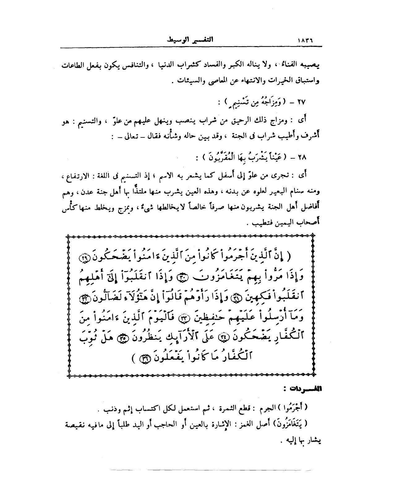 {إِنَّ الَّذِينَ أَجْرَمُوا كَانُوا مِنَ الَّذِينَ آمَنُوا يَضْحَكُونَ (29) وَإِذَا مَرُّوا بِهِمْ يَتَغَامَزُونَ (30) وَإِذَا انْقَلَبُوا إِلَى أَهْلِهِمُ انْقَلَبُوا فَكِهِينَ (31) وَإِذَا رَأَوْهُمْ قَالُوا إِنَّ هَؤُلَاءِ لَضَالُّونَ (32) وَمَا أُرْسِلُوا عَلَيْهِمْ حَافِظِينَ (33) فَالْيَوْمَ الَّذِينَ آمَنُوا مِنَ الْكُفَّارِ يَضْحَكُونَ (34) عَلَى الْأَرَائِكِ يَنْظُرُونَ (35) هَلْ ثُوِّبَ الْكُفَّارُ مَا كَانُوا يَفْعَلُونَ (36)}