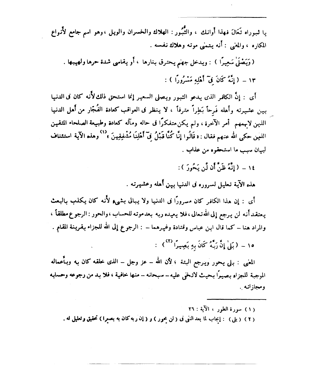 أَي: إِن هذا الكافر كان مسرورًا في الدنيا ولا يبالي بشيءِ لأَنه كان يكذب بالبعث يعتقد أَنه لن يرجع إِلى الله تعالى، فلا يعيده ربه بعد موته للحساب، والحور: الرجوع مطلقًا، والمراد هنا -كما قال ابن عباس وقتادة وغيرهما-: الرجوع إِلى الله للجزاء بقرينة المقام.