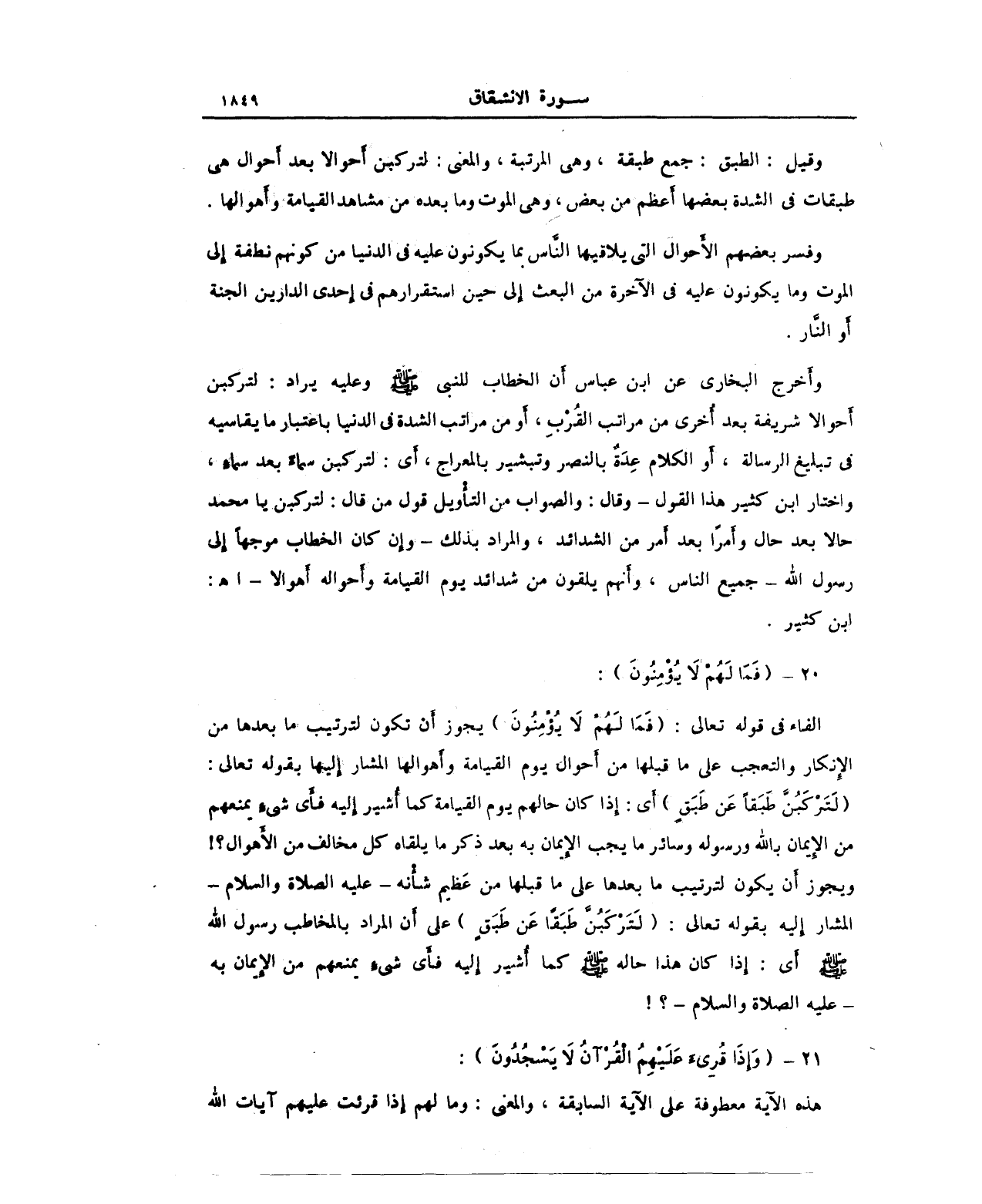 الفاء في قوله تعالى: (فَمَا لَهُمْ لا يُؤْمِنُونَ) يجوز أَن تكون لترتيب ما بعدها من الإِنكار والتعجيب على ما قبلها من أَحوال يوم القيامة وأهوالها المشار إِليها بقوله تعالى: (لَتَرْكَبُنَّ طَبَقًا عَنْ طَبَقٍ) أَي: إِذا كان حالهم يوم القيامة كما أُشير إِليه فأَي شيءٍ يمنعهم من الإِيمان بالله ورسوله وسائر ما يجب الإِيمان به بعد ذكر ما يلقاه كل مخالف من الأَهوال؟ ويجوز أَن يكون لترتيب ما بعدها على ما قبلها من عَظيم شأْنه -عليه الصلاة والسلام- المشار إِليه بقوله تعالى: (لَتَرْكَبُنَّ طَبَقًا عَنْ طَبَقٍ) على أَن المراد بالمخاطب رسول الله صلى الله عليه وسلم أَي: إِذا كان هذا حاله صلى الله عليه وسلم كما أُشير إِليه فأَي شيءٍ يمنعهم من الإِيمان به - عليه الصلاة والسلام؟!