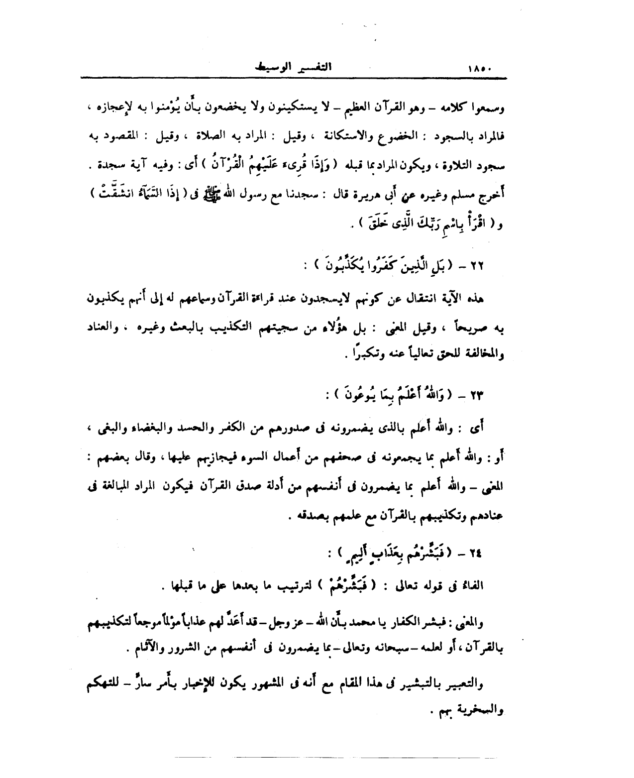 هذه الآية انتقال عن كونهم لا يسجدون عند قراءَة القرآن وسماعهم له إِلى أَنهم يكذبون به صريحًا، وقيل المعنى: بل هؤُلاءِ من سجيتهم التكذيب بالبعث وغيره، والعناد والمخالفة للحق تعاليًا عنه وتكبرًا.