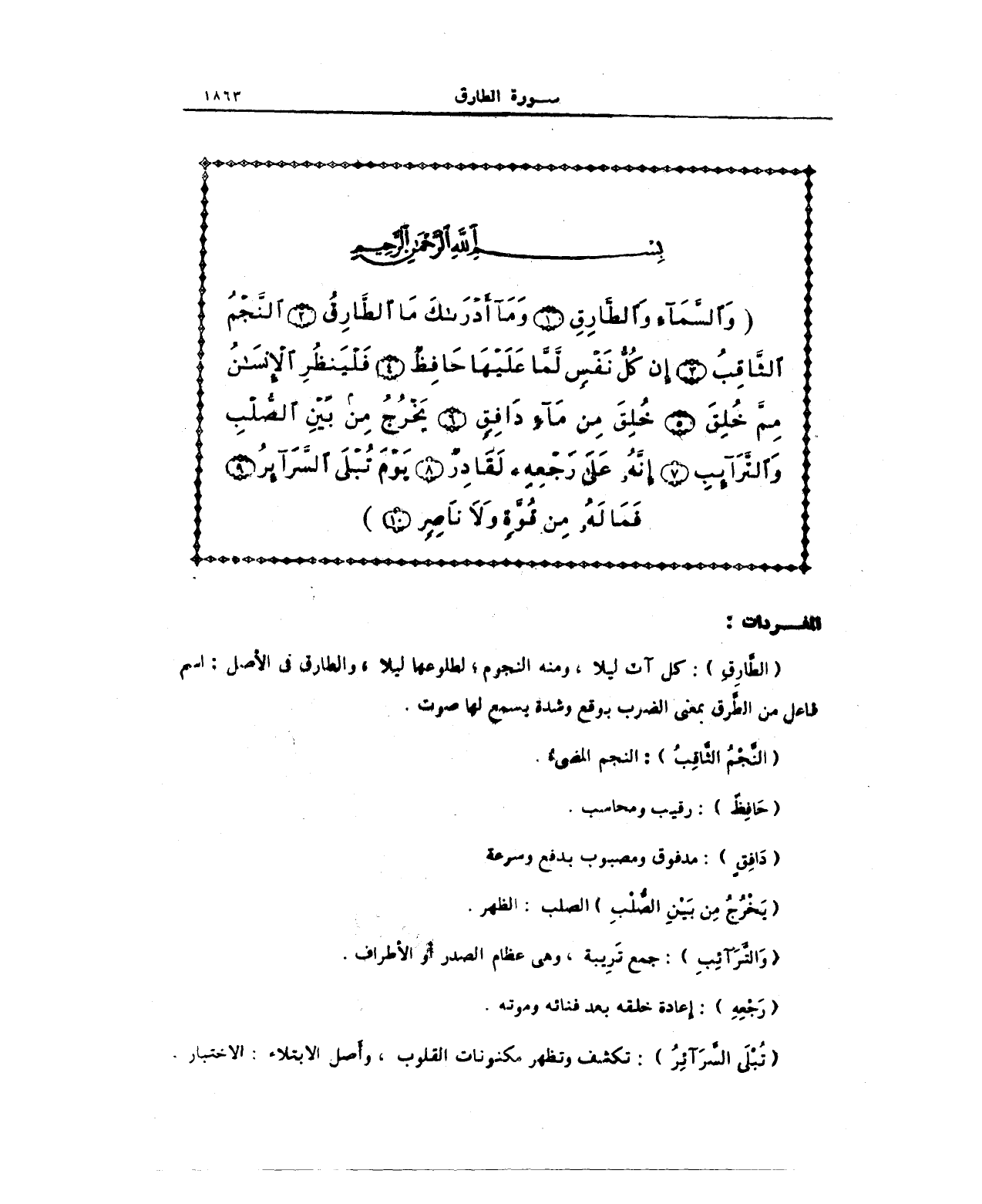 (وَالسَّمَاءِ وَالطَّارِقِ (1) وَمَا أَدْرَاكَ مَا الطَّارِقُ (2) النَّجْمُ الثَّاقِبُ (3) إِنْ كُلُّ نَفْسٍ لَمَّا عَلَيْهَا حَافِظٌ (4) فَلْيَنْظُرِ الْإِنْسَانُ مِمَّ خُلِقَ (5) خُلِقَ مِنْ مَاءٍ دَافِقٍ (6) يَخْرُجُ مِنْ بَيْنِ الصُّلْبِ وَالتَّرَائِبِ (7) إِنَّهُ عَلَى رَجْعِهِ لَقَادِرٌ (8) يَوْمَ تُبْلَى السَّرَائِرُ (9) فَمَا لَهُ مِنْ قُوَّةٍ وَلَا نَاصِرٍ (10))