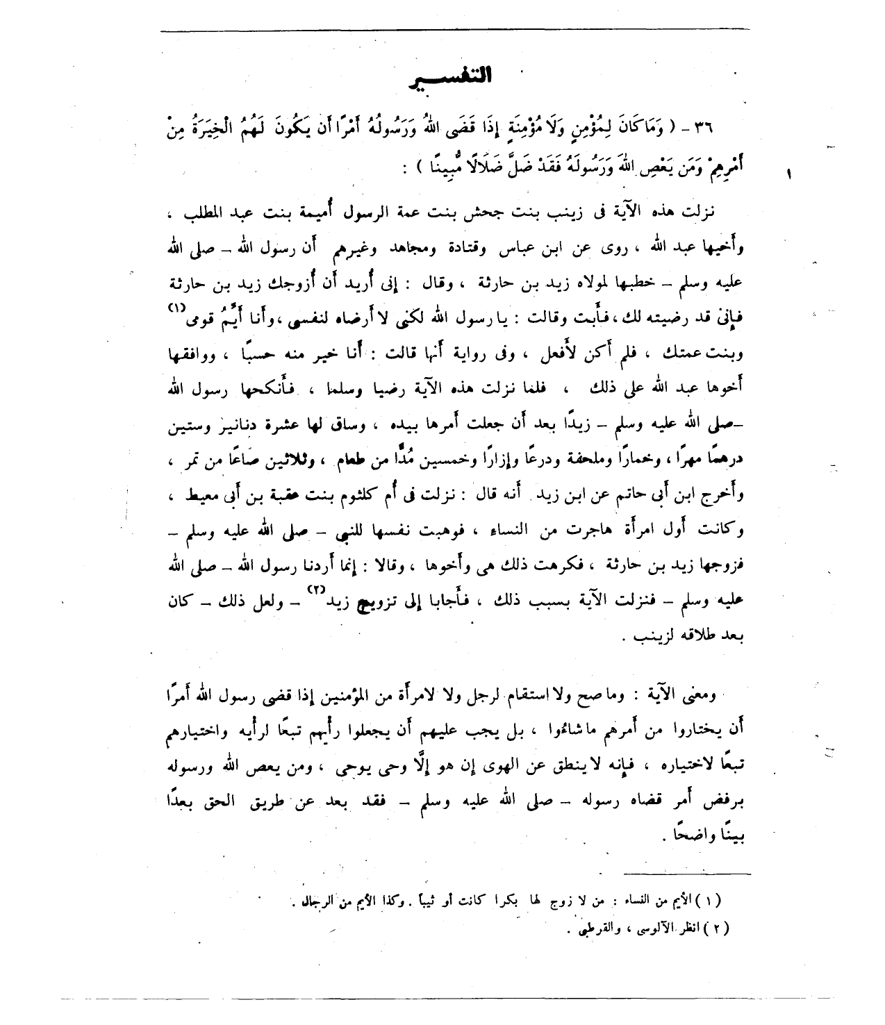 نزلت هذه الآية في زينب بنت جحش بنت عمة الرسول أُميمة بنت عبد المطلب: وأخيها عبد الله، روى من ابن عباس وقتادة ومجاهد وغيرهم أن رسول الله - صلى الله عليه وسلم - خطبها لمولاه زيد بن حارثة، وقال: إني أُريد أَن أُزوجك زيد بن حارثة فإني قد رضيته لك، فأَبت وقالت: يا رسول الله لكن لا أرضاه لنفسى، وأَنا أَيِّمُ قومي (¬1) وبنت عمتك، فلم أكن لأَفعل، وفي رواية أنها قالت: أنا خير منه حسبًا، ووافقها أخوها عبد الله على ذلك، فلما نزلت هذه الآية رضيا وسلما، فأَنكحها رسول الله - صلى الله عليه وسلم - زيدًا بعد أَن جعلت أمرها بيده، وساق لها عشرة دنانير وستين درهمًا مهرًا، وخمارًا وملحفة ودرعًا وإزارًا وخمسين مُدًّا من طعام، وثلاثين صاعًا من تمر، وأخرج ابن أبي حاتم عن ابن زيد. أَنه قال: نزلت في أُم كلثوم بنت عقبة بن أبي معيط، وكانت أَول امرأَة هاجرت من النساءِ، فوهبت نفسها للنبي - صلى الله عليه وسلم - فزوجها زيد بن حارثة، فكرهت ذلك هي وأَخوها، وقالا: إنما أَردنا رسول الله - صلى الله عليه وسلم - فنزلت الآية بسبب ذلك، فأَجابا إلى تزويج زيد (¬2) - ولعل ذلك - كان بعد طلاقه لزينب.