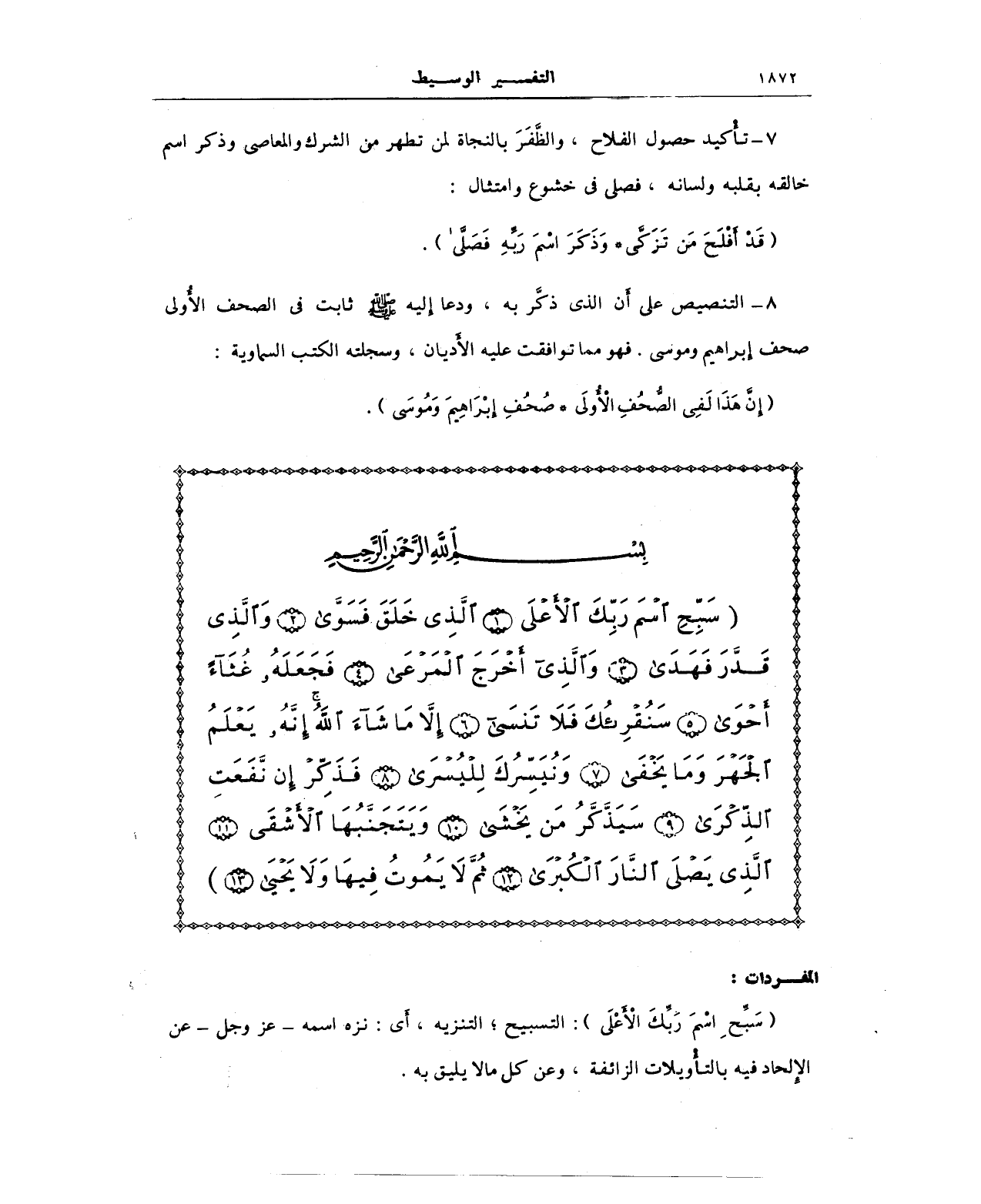 سَبِّحِ اسْمَ رَبِّكَ الْأَعْلَى (1) الَّذِي خَلَقَ فَسَوَّى (2) وَالَّذِي قَدَّرَ فَهَدَى (3) وَالَّذِي أَخْرَجَ الْمَرْعَى (4) فَجَعَلَهُ غُثَاءً أَحْوَى (5) سَنُقْرِئُكَ فَلَا تَنْسَى (6) إِلَّا مَا شَاءَ اللَّهُ إِنَّهُ يَعْلَمُ الْجَهْرَ وَمَا يَخْفَى (7) وَنُيَسِّرُكَ لِلْيُسْرَى (8) فَذَكِّرْ إِنْ نَفَعَتِ الذِّكْرَى (9) سَيَذَّكَّرُ مَنْ يَخْشَى (10) وَيَتَجَنَّبُهَا الْأَشْقَى (11) الَّذِي يَصْلَى النَّارَ الْكُبْرَى (12) ثُمَّ لَا يَمُوتُ فِيهَا وَلَا يَحْيَى (13))